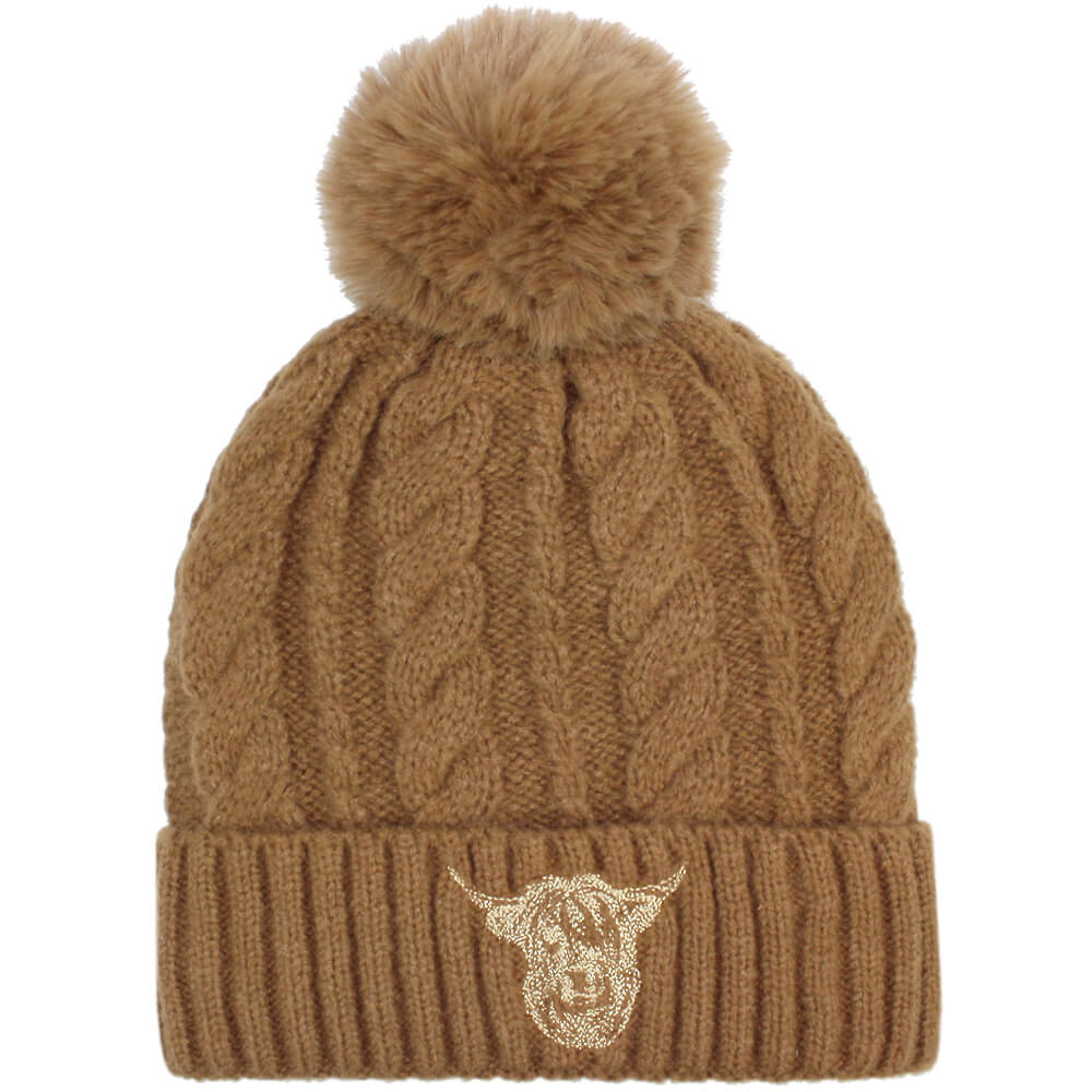 Stay cosy and stylish with our caramel-coloured bobble hat, featuring a beautifully embroidered Highland cow illustration on the front. This charming design adds a unique touch to your winter wardrobe, making it the perfect accessory for embracing the cold in style.