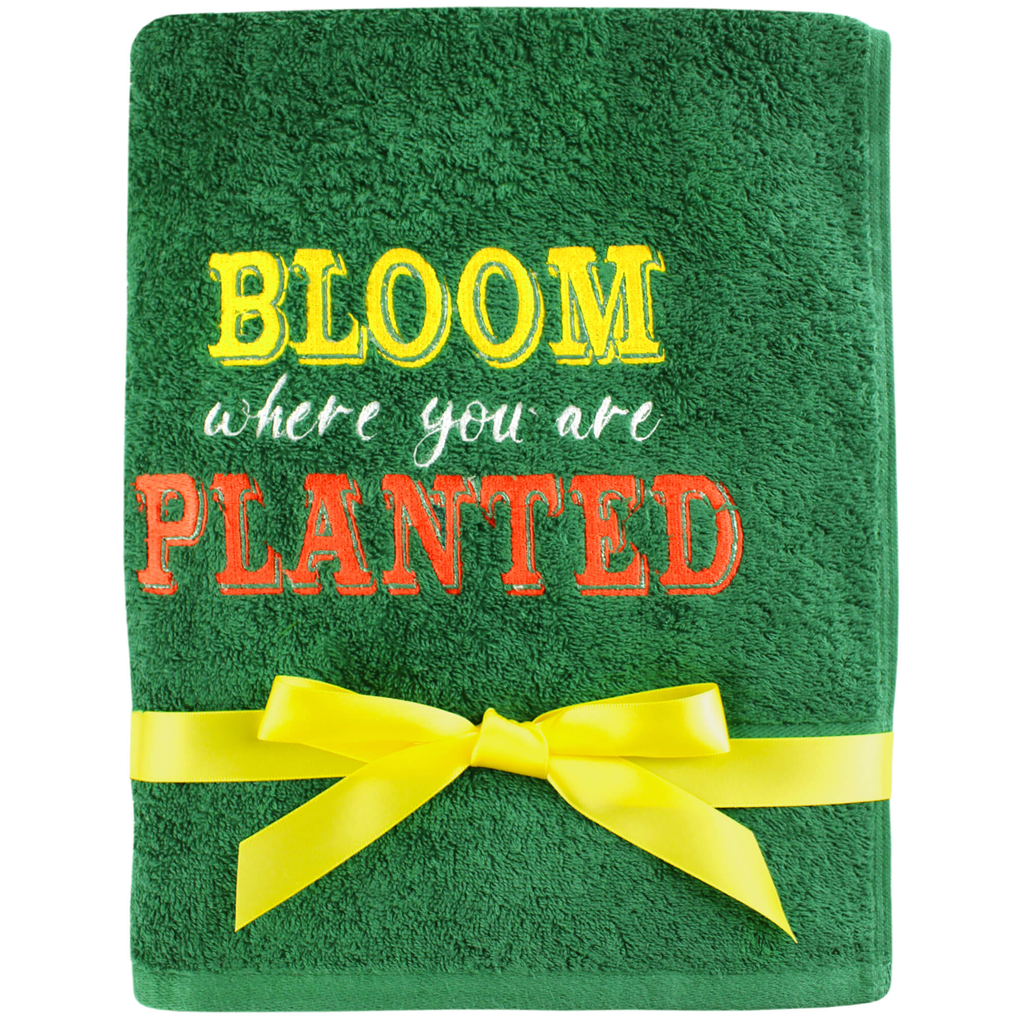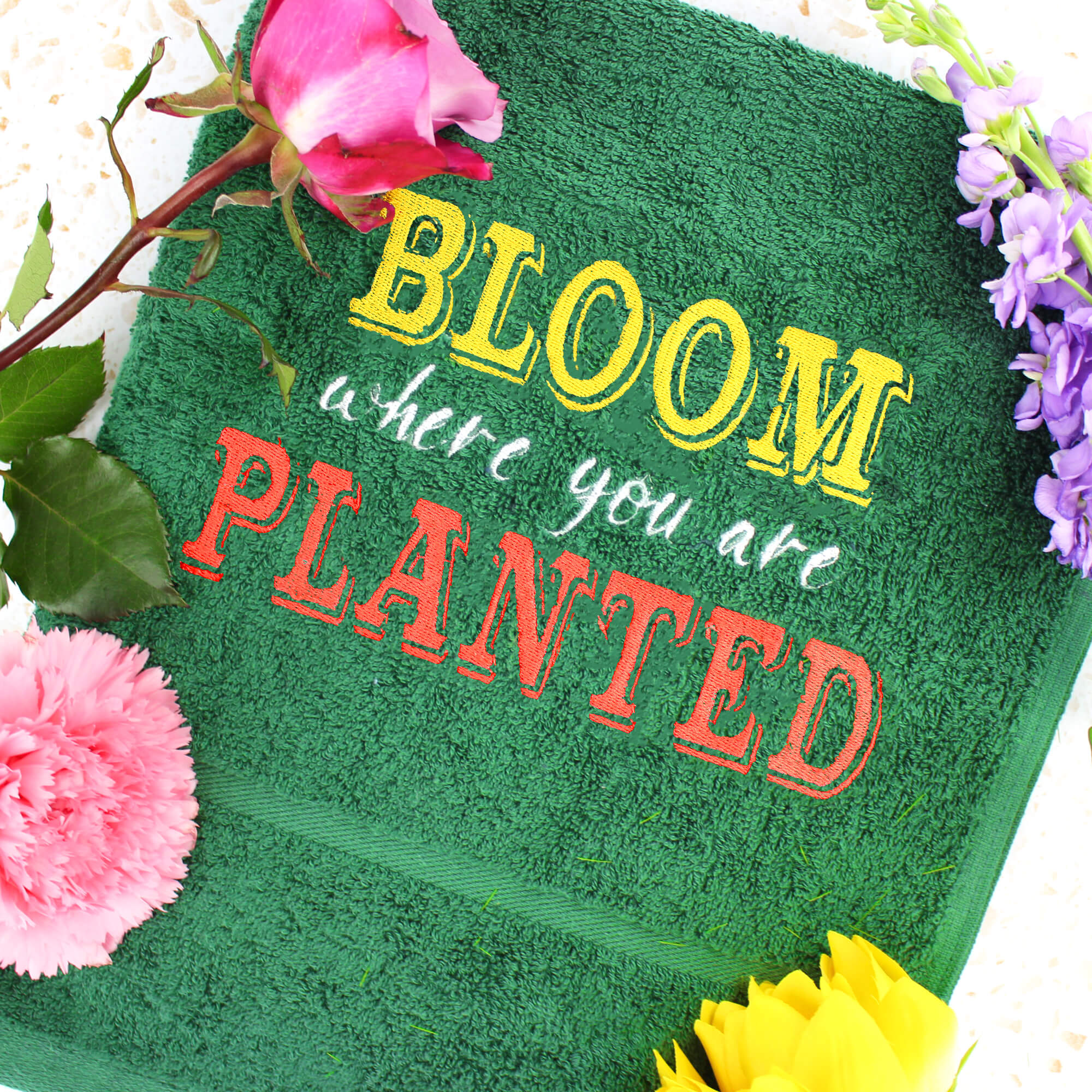 This super soft 100% Egyptian Combed Cotton hand towel in a beautiful rich shade of green features an uplifting, positive saying, ‘Bloom where you are planted’. Professionally embroidered in lovely, bright high quality thread, this makes a fantastic gift for gardening enthusiasts!