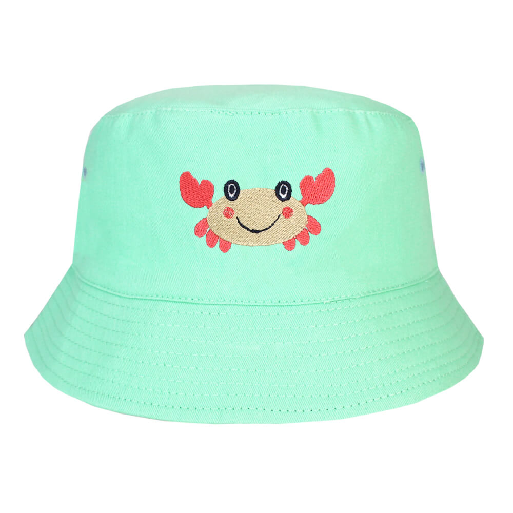 Keep them shaded from the sun in this fun bucket style hat. Choose from a cute crab or lovable lobster design, beautifully embroidered – they look great against the bright seafoam base colour of the hat! Available in two sizes. Perfect for summer holidays, sunny school days or fun in the garden!