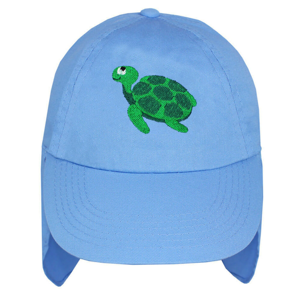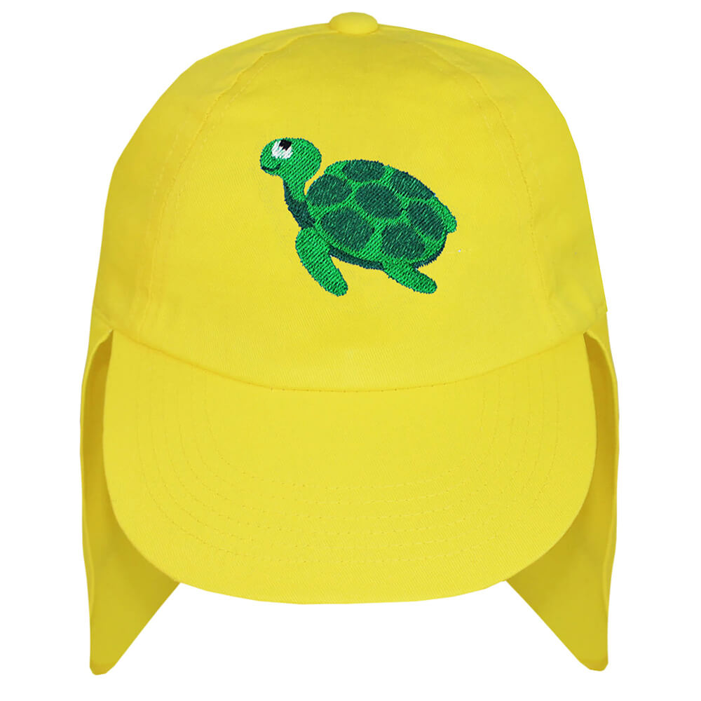Get beach holiday ready with our colourful kids turtle embroidered legionnaire hats! Choose from Sky Blue or Sunshine Yellow for the perfect holiday hat!