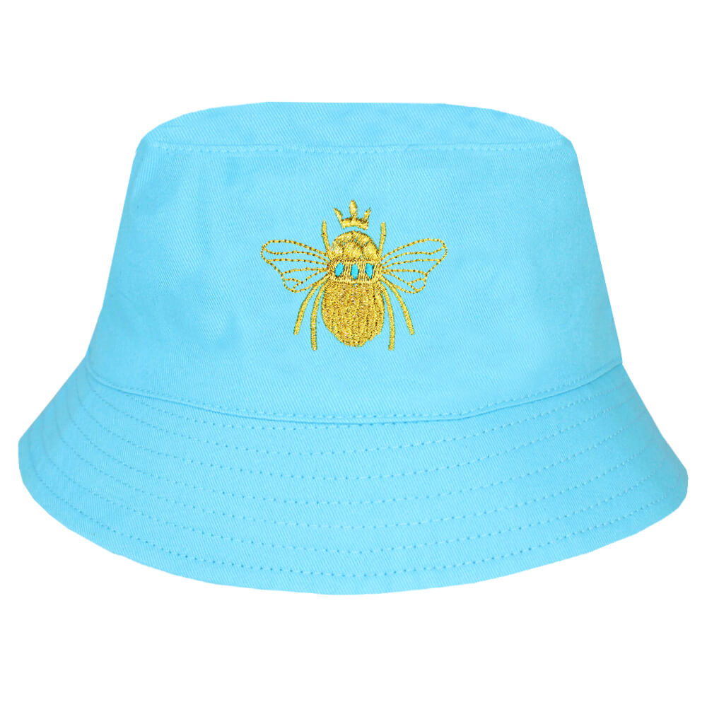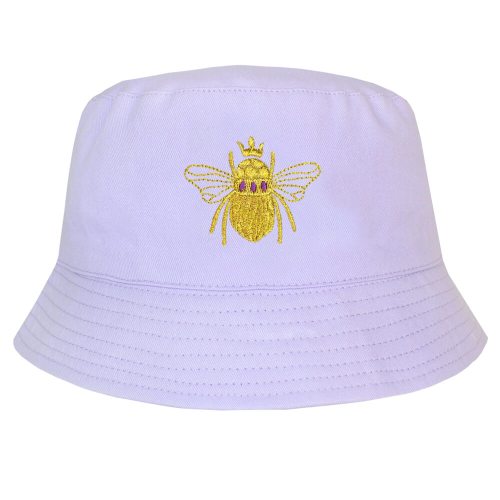 Our bucket style hat is available in three gorgeous colours – lilac, fuchsia and turquoise, each has an embroidered gold bee wearing a crown with three little embroidered jewels in a complementing colour. Perfect for the upcoming King’s Coronation celebrations if you want something a bit different to the red, white and blue designs! Ideal to wear all summer long to keep little heads protected from the sun.