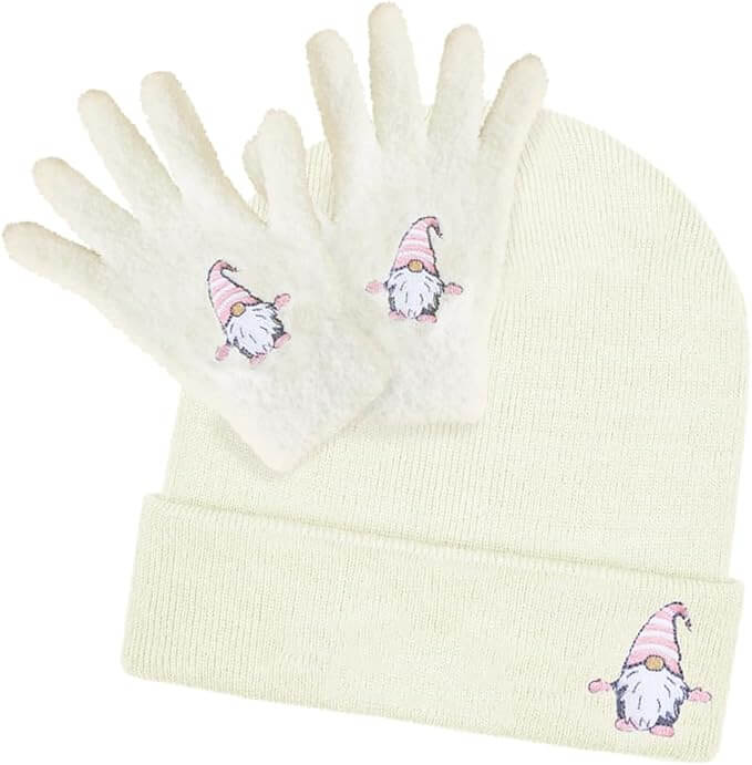 Gonk Gnome Embroidered Cream Beanie Hat & Fluffy Gloves