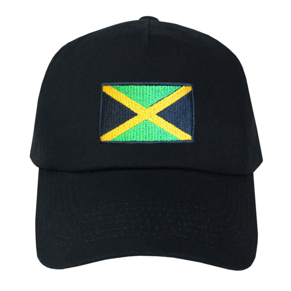 Smart black adjustable baseball cap with embroidered Jamaican Flag. Fully adjustable fastening for ideal fit and stiff peak provides protection from the sun. Super soft, cool cotton and 6 panel construction designed for maximum comfort.