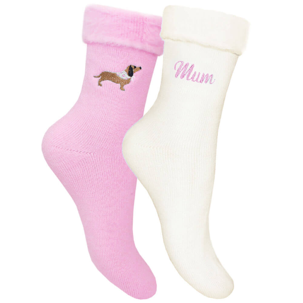 Our cute and cosy ladies personalised bed socks gift set features a gorgeous sausage dog wearing a neckerchief on one pair and space for you to add your personalisation, on the second pair in professional embroidered! Available in 2 on trend colourways, choose from pastel blue & cream or pink & cream, and fleece lined for extra softness & warmth, this is a perfect gift for someone special!