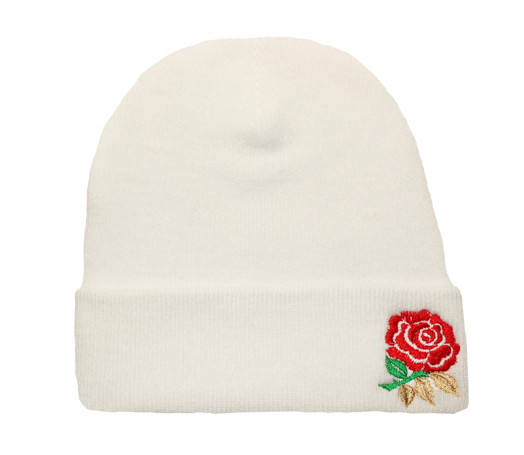 Super soft fine knit embroidered England rose beanie hat for adults – warm, snug, and perfect for winter.