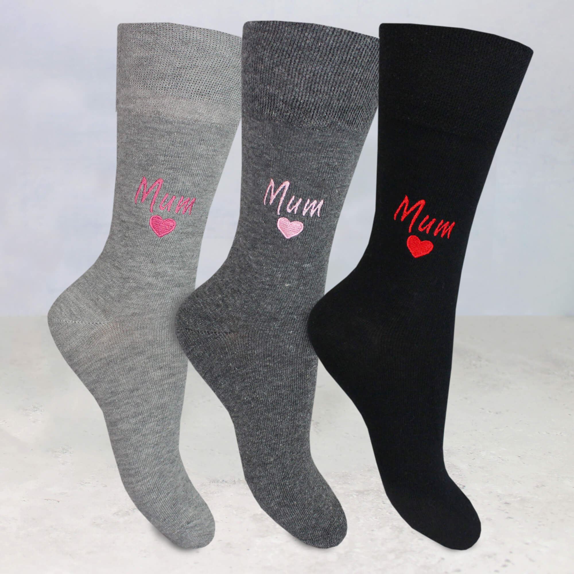 Show your mum some love with this lovely 3 pack of embroidered ‘Mum’ socks featuring a love heart on shades of black and grey!