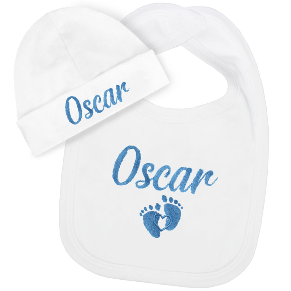 A personalised embroidered baby bib and hat is a thoughtful baby gift. It adds a special touch to the baby’s early days. It helps protect clothes from spills and messes, making meal times a little less stressful. Perfect for introducing baby’s first foods. Made from 100% cotton, the hat is super soft and gentle on the baby’s delicate skin.
