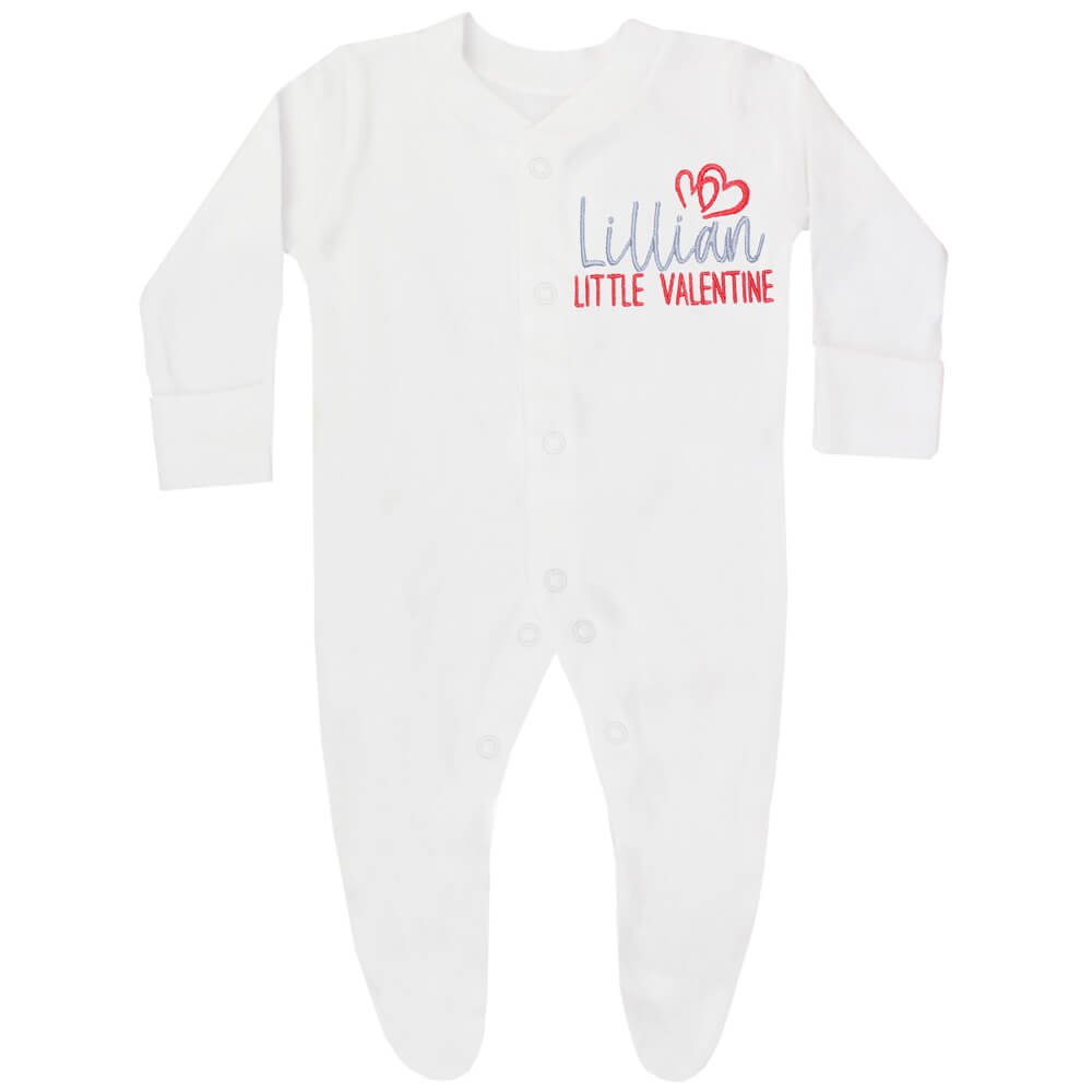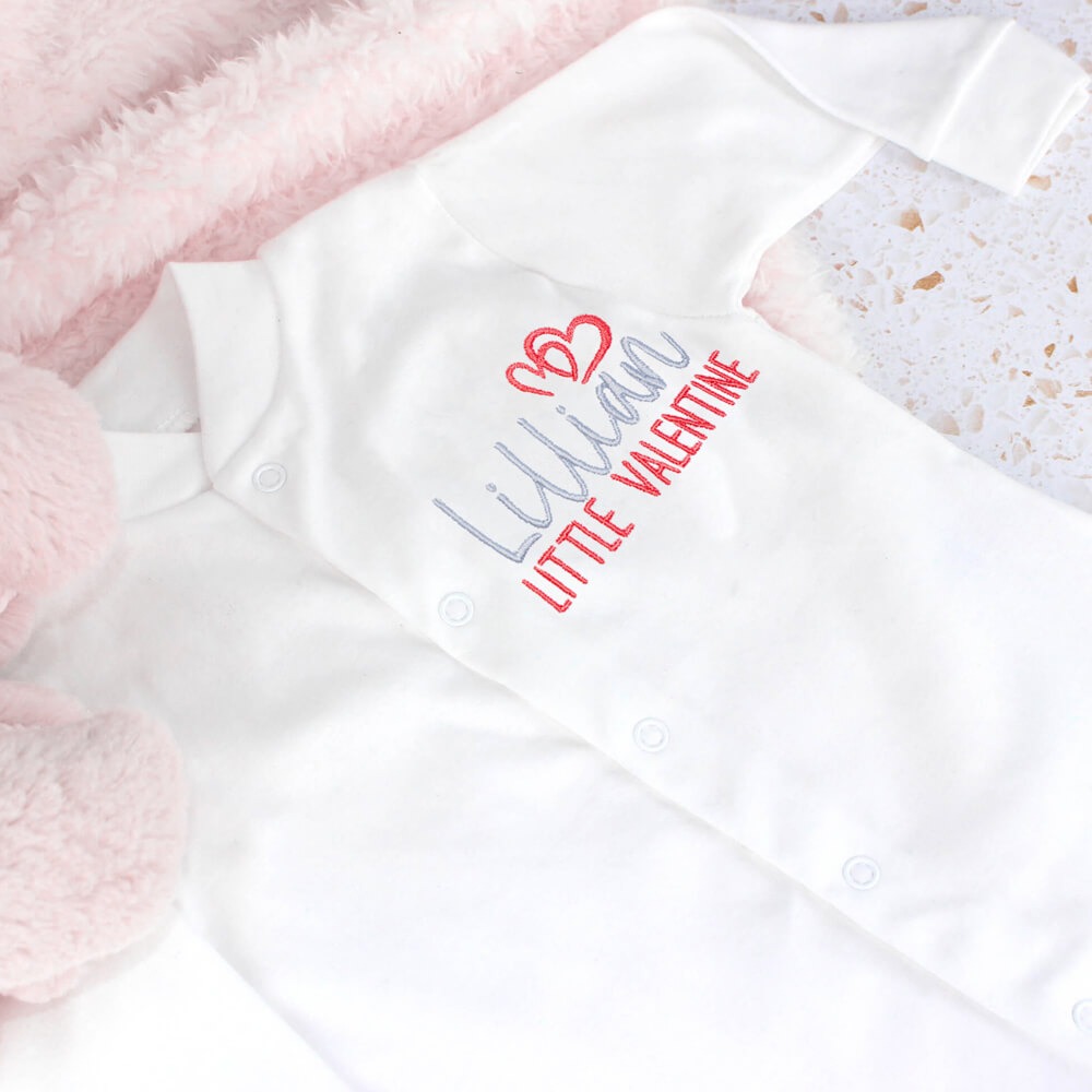 Take the cuteness to the next level with our adorable personalised ‘Little Valentine’ baby sleepsuit. Featuring satin stitch hearts, your little one’s name and Little Valentine embroidery on a super soft cotton jersey! Perfect for snuggling, playing and naps!