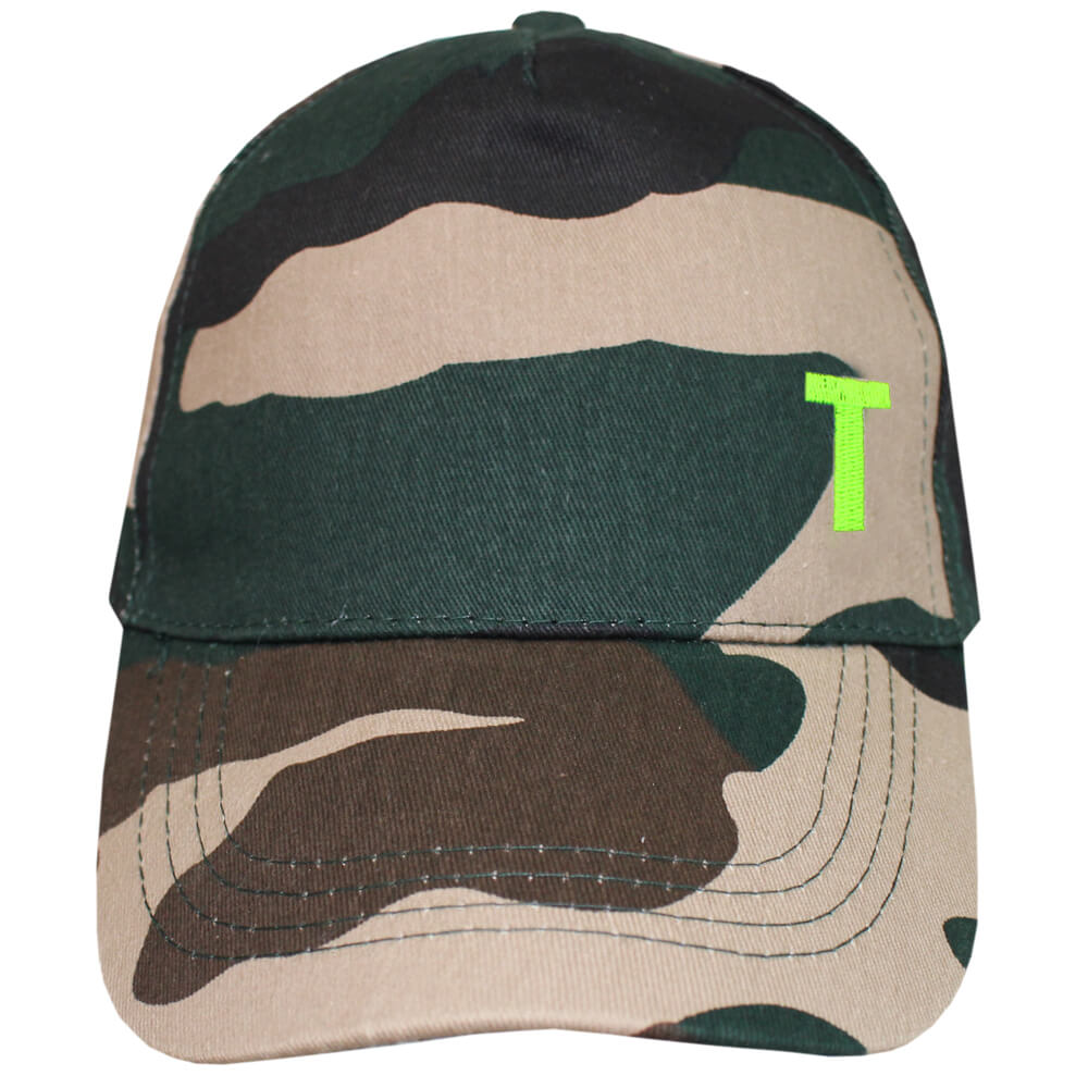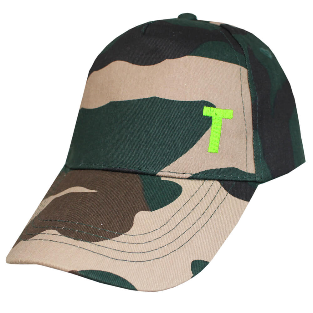 A really cool baseball cap they will love to wear, with an all over camouflage print and your chosen initial embroidered in contrasting matte neon green thread! Fits ages 6-10 years and has an adjustable fastening at the back for an ideal fit. 100% cotton keeps them cool and comfortable while the stiff peak provides protection from the sun. Perfect for all that summer has to offer, from holidays to festivals!