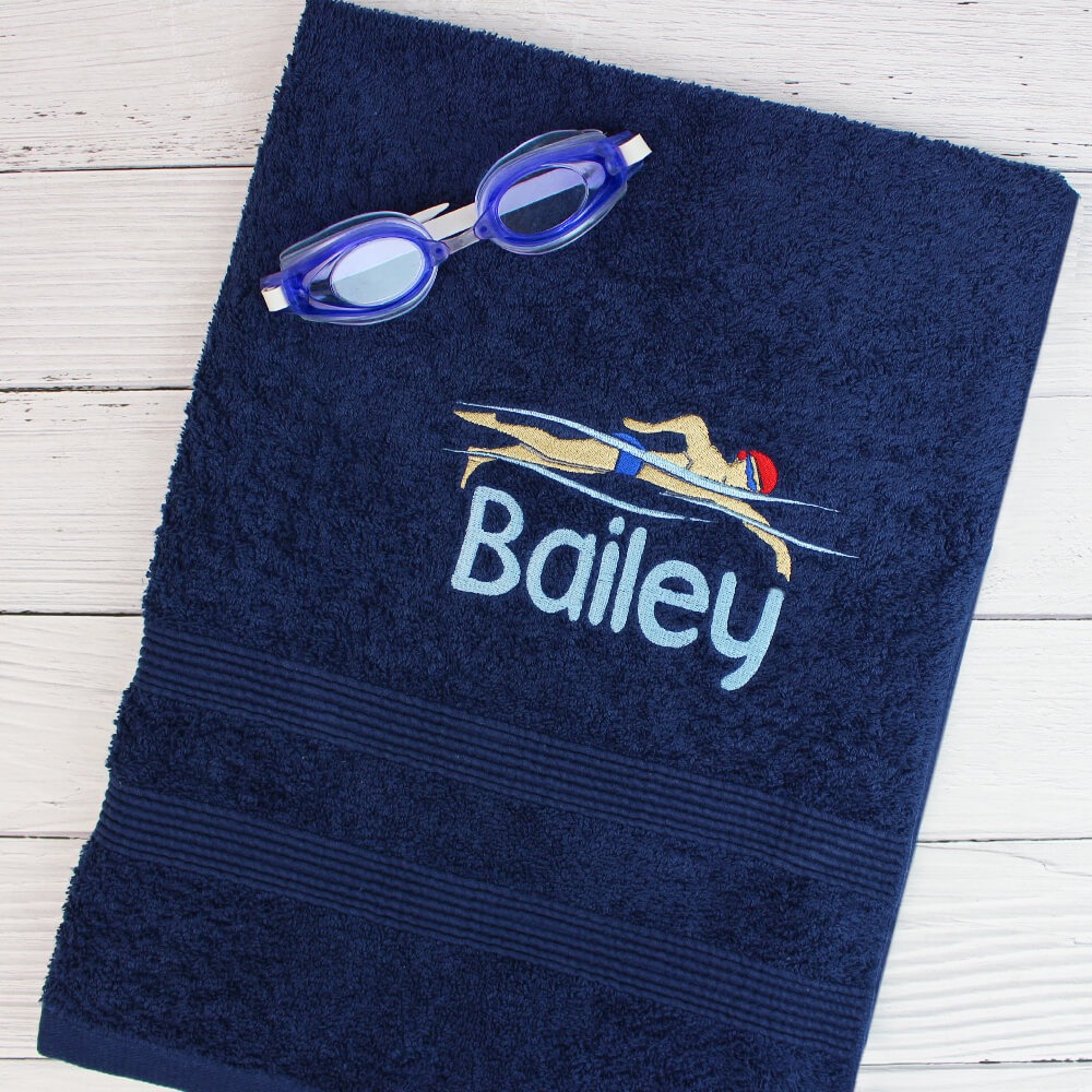 Our Personalised navy children’s swimming towel is ideal for their school PE kit or swimming lessons! It looks great and its super soft and absorbent. It features an embroidered swimmer design with space underneath for your personalisation, also embroidered. A lovely gift for young swimming stars!