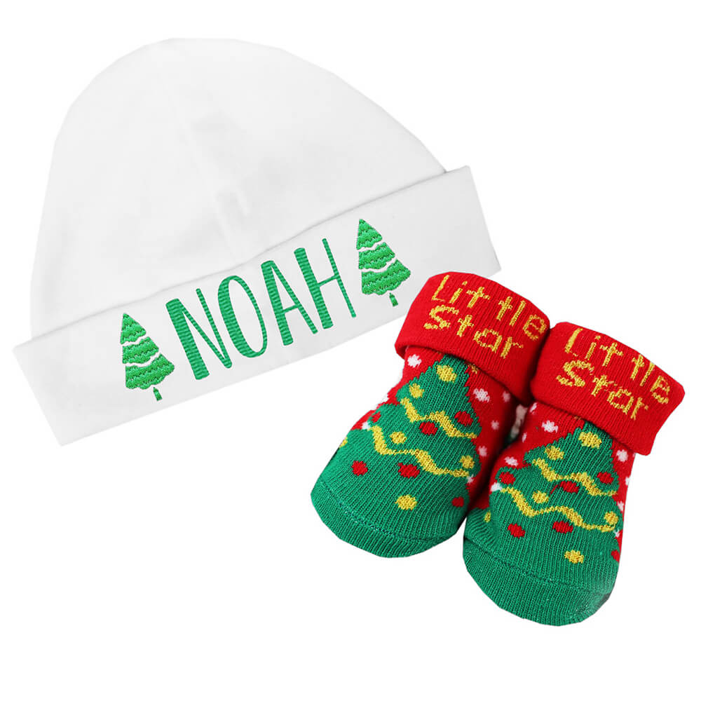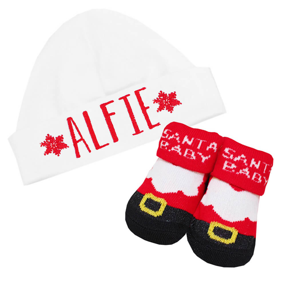 Our adorable personalised cotton baby hat complete with festive themed sock booties is a perfect gift for baby’s first Christmas! Choose from four fun and cheerful designs – Santa, Christmas Tree, Reindeer or Christmas Pudding. The cotton hat has two little festive motifs and space for your chosen name. Together with the sock booties, this is the perfect set to wear for those all important Christmas photoshoots!