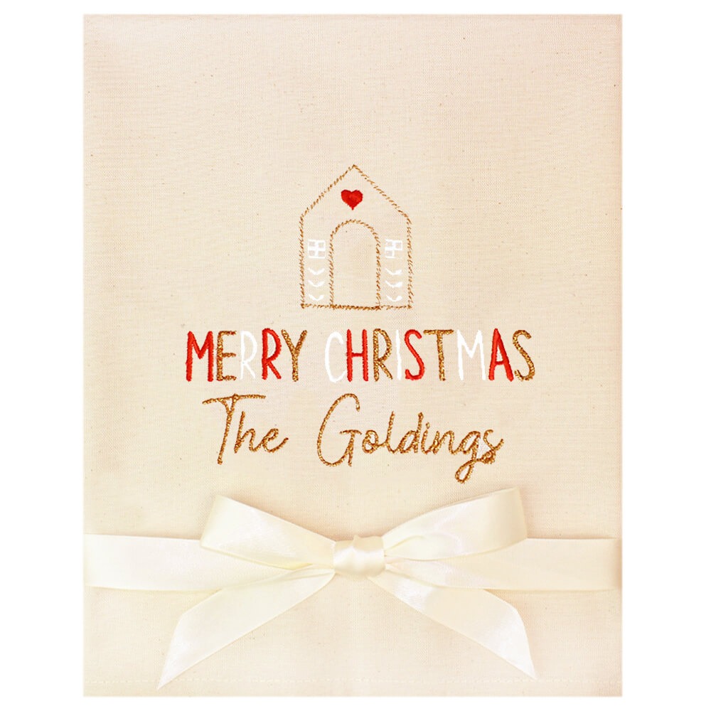 Spruce up the Christmas dinner table with this gorgeous glitter embroidered custom family name tea towel! Using our specialist luxury glitter embroidery thread to add a sprinkle of Christmas sparkle to your kitchen. Featuring a whimsical stitched out gingerbread house and multi-colour lettering, creating festive charm by the bucket load! You can personalise the tea towel with a name of your choice to make a truly special gift that can be treasured for years to come! Built for durability, our 100% cotton tea towels stay soft wash after wash.