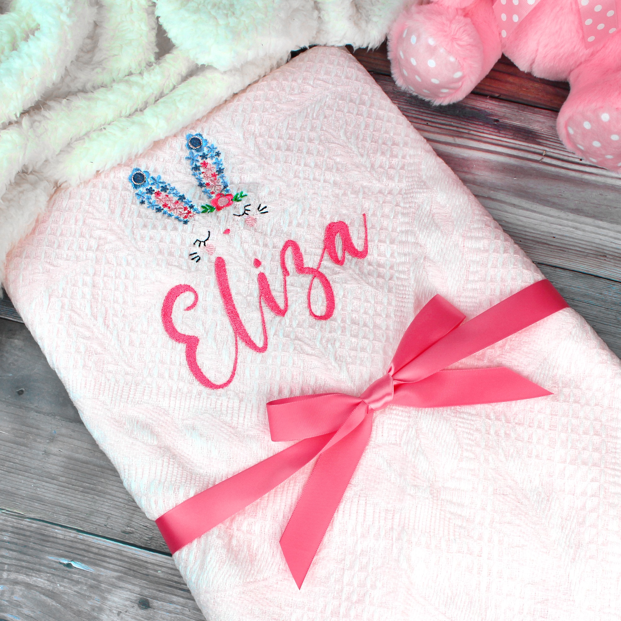 Personalised Cute Pink Floral Bunny Ears Baby Shawl Blanket