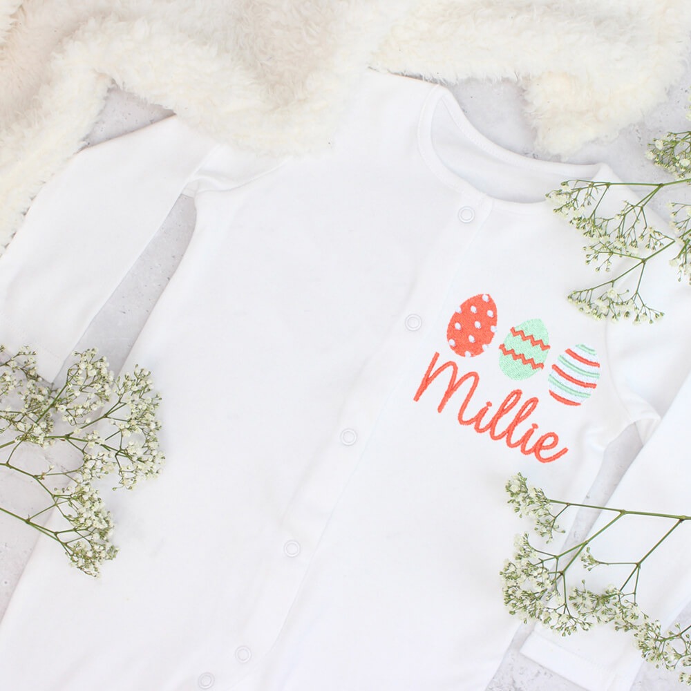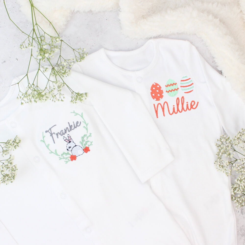 Get in the Easter spirit with one of our adorable sleepsuits. Choose from either a bright and fun egg design or a gorgeous whimsical bunny motif, it’s hard to pick a favourite! Both can be personalised with your chosen name embroidered in high quality thread, perfect for baby’s first Easter!