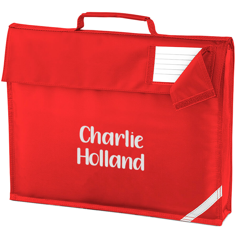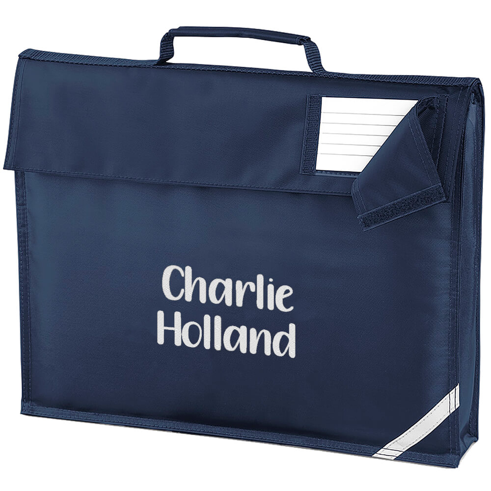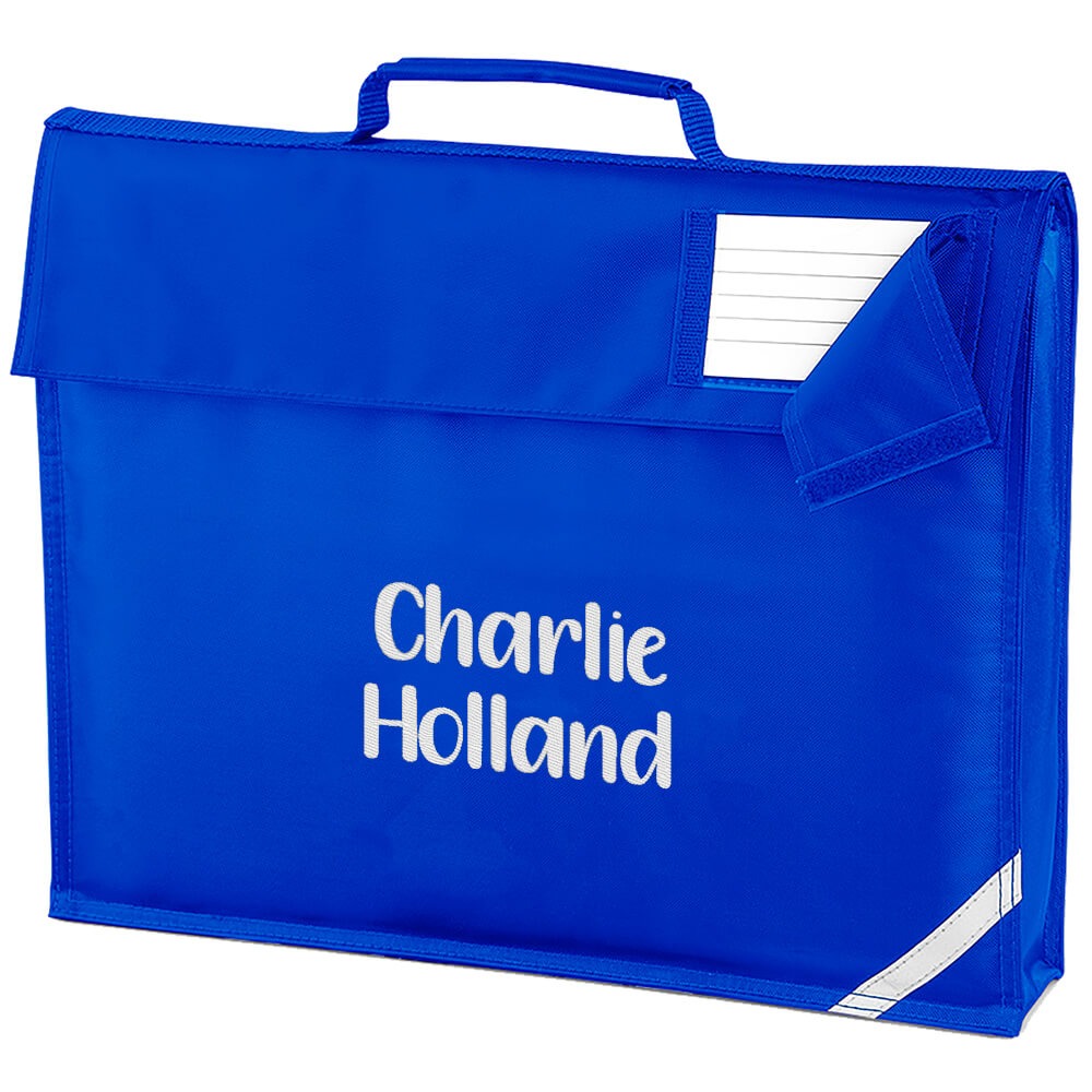 Our practical and durable school book & document satchel style bag is tough enough to stand up to classroom wear and tear, keeping books, homework and important letters safe and neat. It measures 37 x 30 x 6cm so it’s roomy enough for everything that’s needed on a busy school day and the Velcro strip ensures nothing falls out but is quick & easy to open. The high visibility reflective stripe in the corner of the bag provides an added safety element for walks home from school and an internal zipped pocket keeps precious items safe. Small hands will stay comfortable carrying this bag thanks to its padded handle. Your personalisation professionally embroidered in high quality thread by one of our team in Derbyshire adds a smart finishing touch!