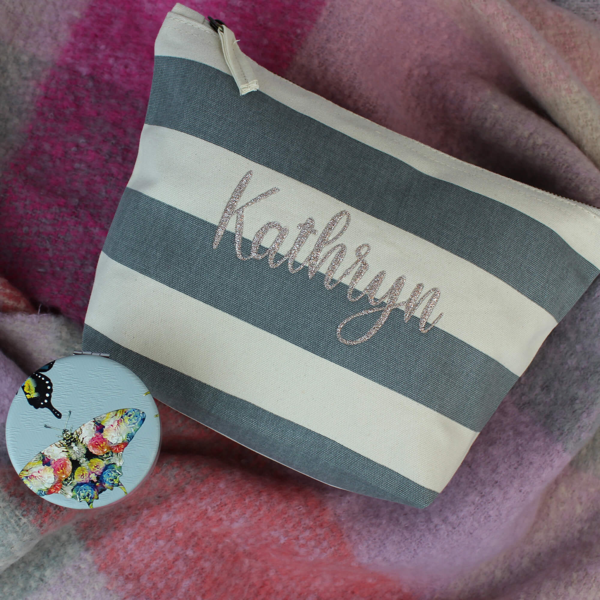 Personalised with glitter embroidery on a nautical grey and cream stripy canvas wash bag.
