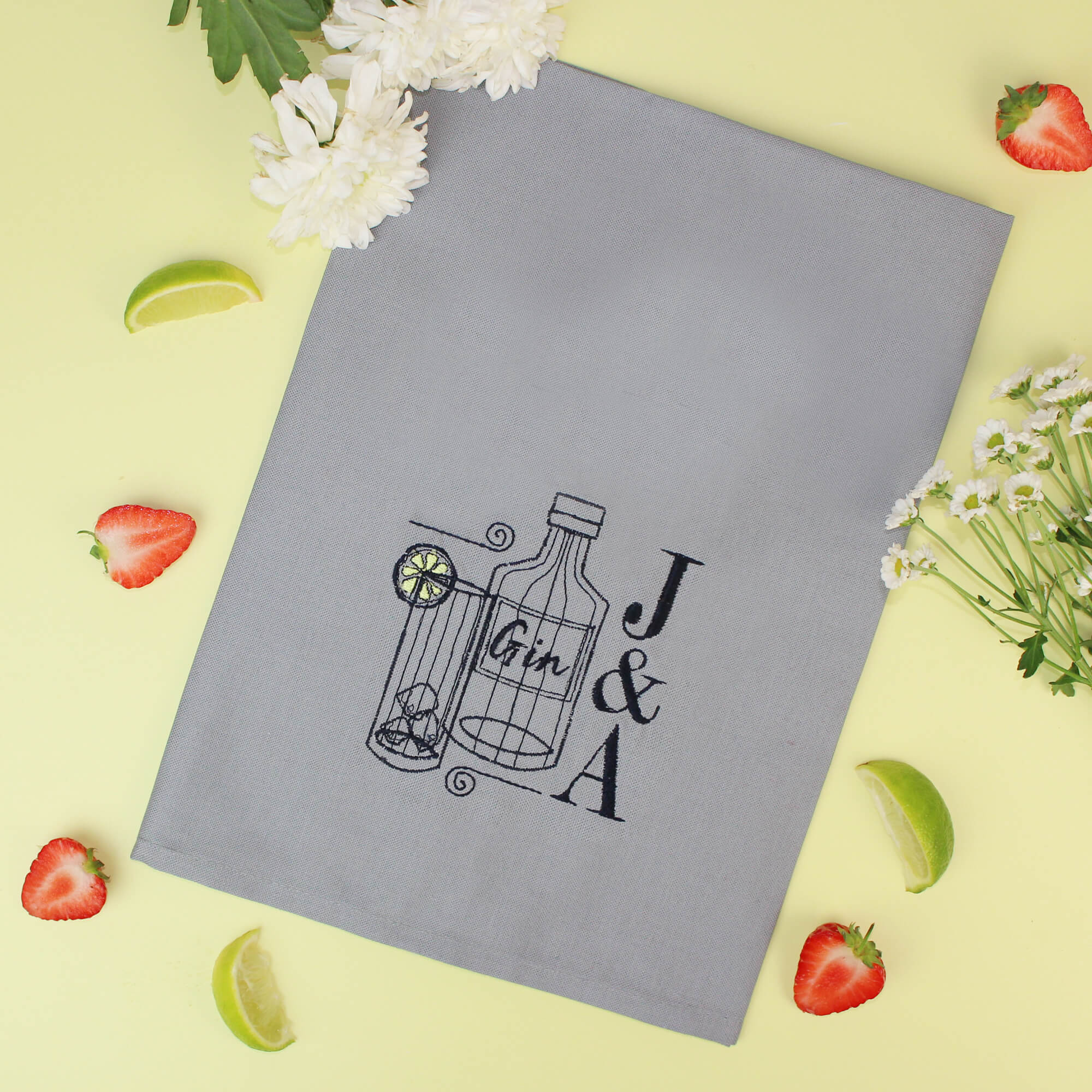 Personalised Grey Gin Design Embroidered Tea Towel. Super Soft 100% Cotton Tea Towel with Your Initials, a Great Addition to the Kitchen! High Quality, Professional Embroidery. Machine Washable. A Perfect Gift!