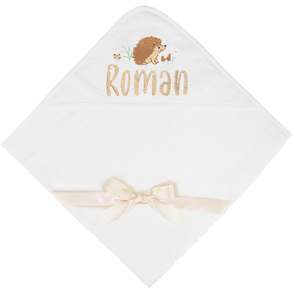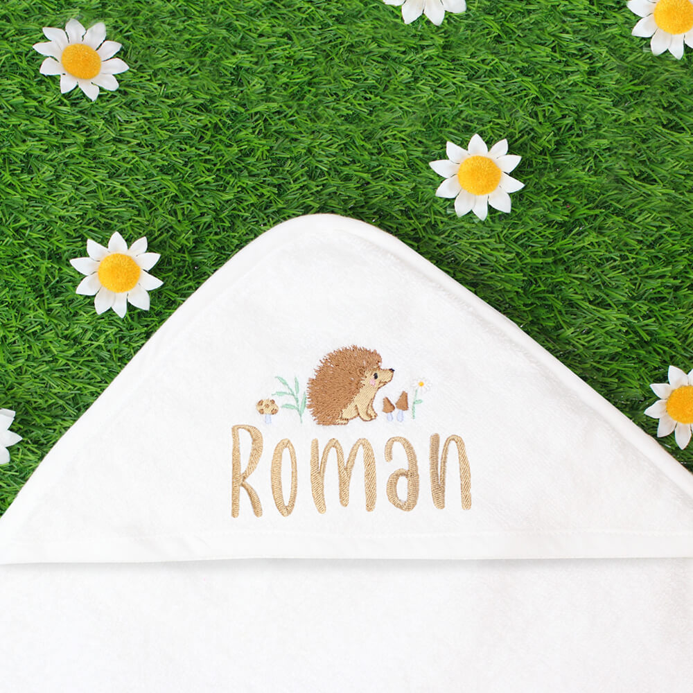 This gorgeously soft white hooded baby bath towel makes a perfect gender neutral baby gift! It features the cutest hedgehog motif and space to add your personalisation, all of which will be professionally embroidered by one of our team. Made from super soft and absorbent cotton, it’s idea for post bath time cosy snuggles.