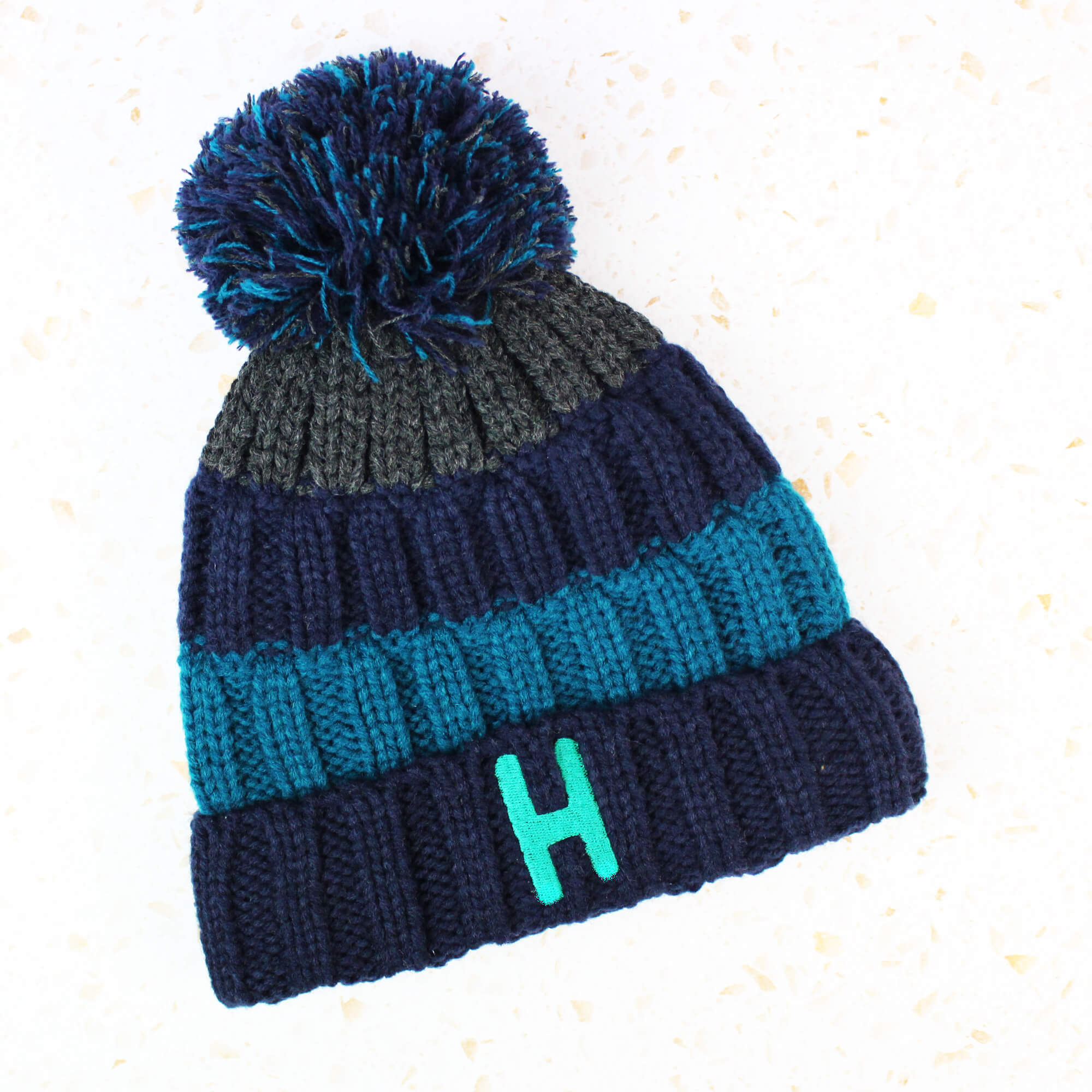 Personalised Initial Blue Striped Knitted Bobble Hat