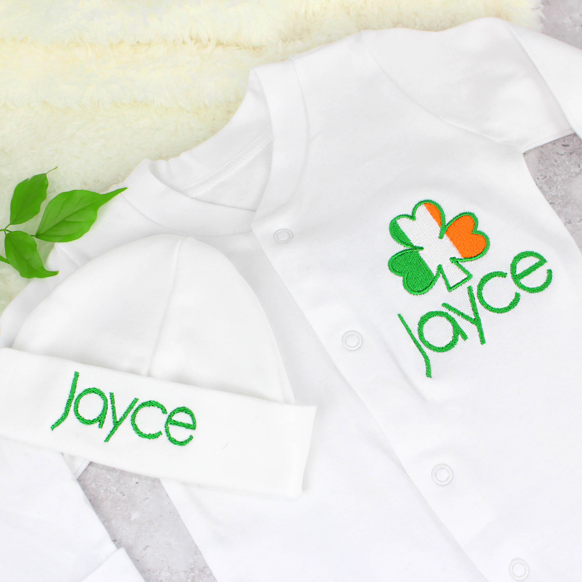 Personalised Irish Baby Ireland Shamrock Sleepsuit & Hat Set