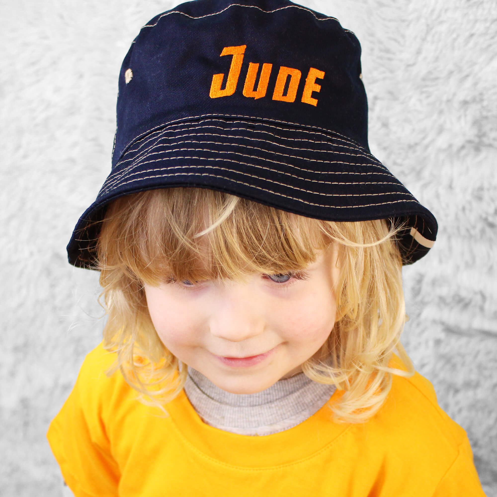 Get prepared for those sunny days with our navy 100% cotton bucket hat personalised in orange superhero font!