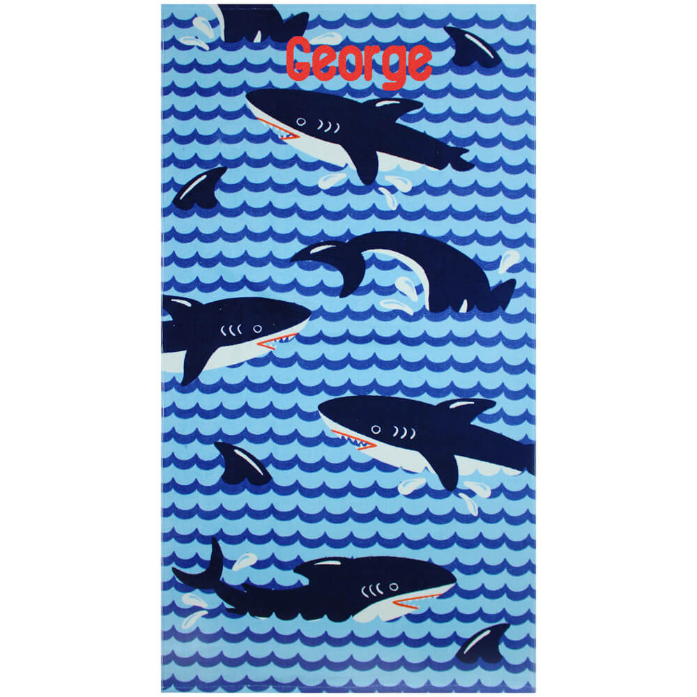 Shark fans will love this super soft beach towel with bold and funky sharks splashing about in the waves! Add your chosen name and it will be embroidered in a bright, eye catching red that really complements the print. Perfect for holidays, swimming lessons or summer days in the garden!
