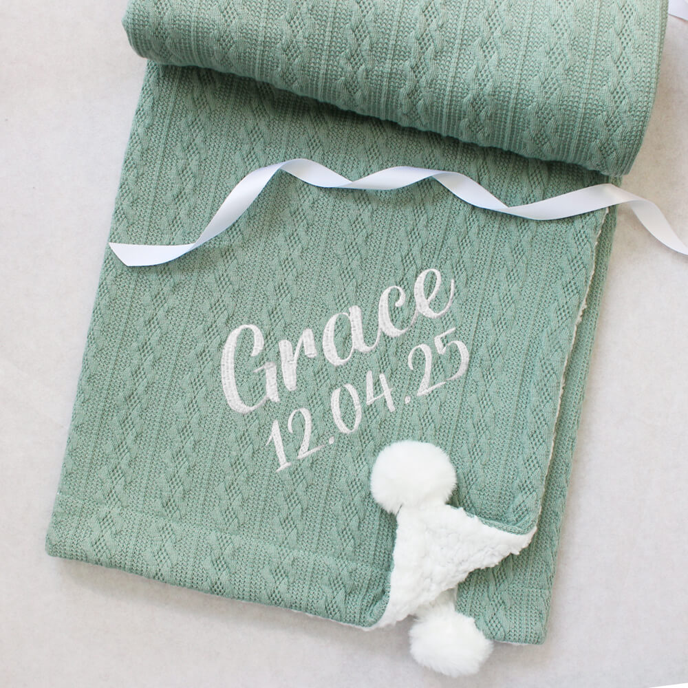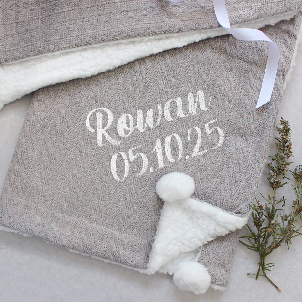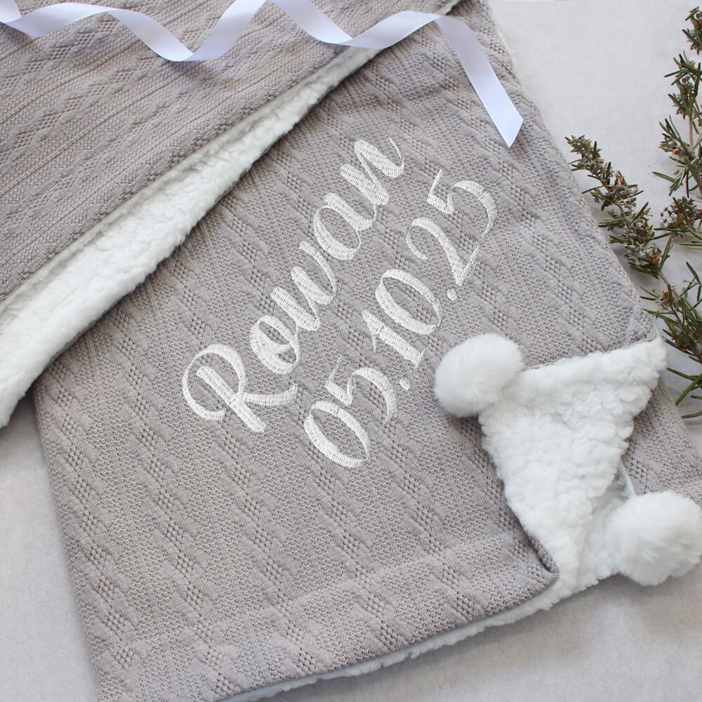 Look no further than our luxury knitted sherpa fleece lined baby blankets embroidered with your choice of name and text for the ultimate baby blanket keepsake! A gift to treasure!