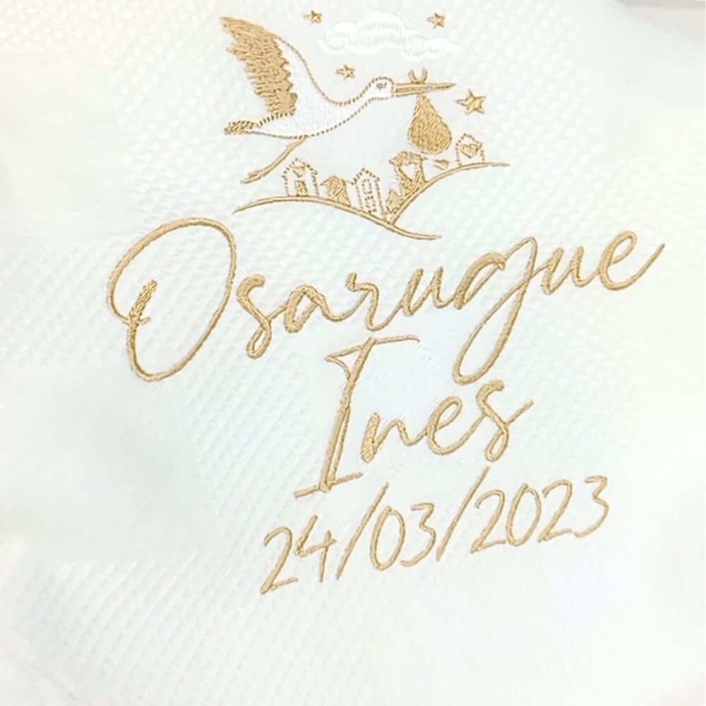 If you’re looking for a newborn baby gift with the wow factor, this white and gold stork design shawl has it! Featuring our very own stork embroidery design, portraying a beautiful village on a starry night with the gentle stork symbol, complete with your own personalised name and date.