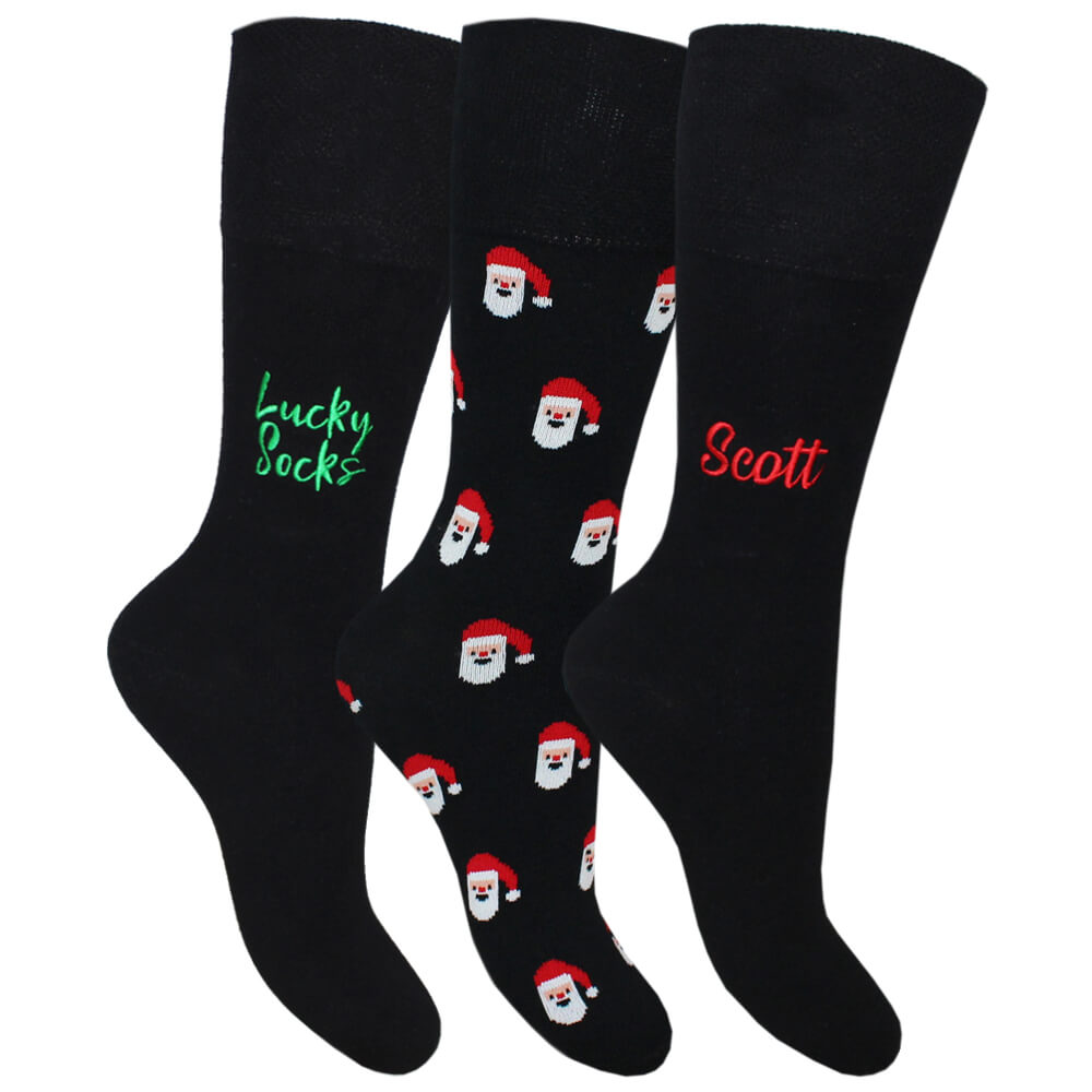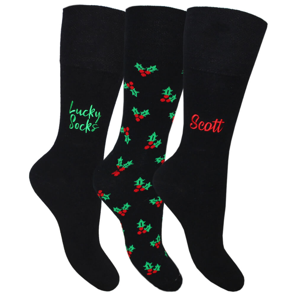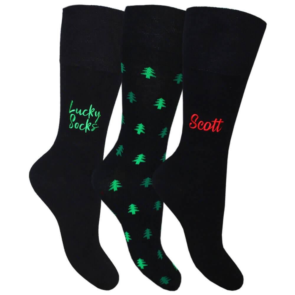 Our 3 pair pack of men’s extra soft comfort novelty Christmas socks make the ideal stocking filler! Choose from Santa, festive holly or Christmas trees for one pair, then personalise a pair with a name embroidered in high quality thread and the third pair features the wording, ‘Lucky Socks,’ the perfect good luck charm!