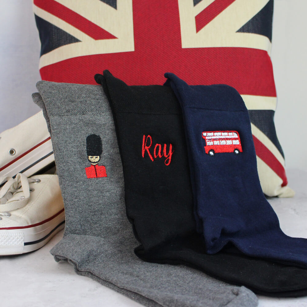 Smarten up their sock drawer with this London inspired sock set. Choose from 3 different London icon motif combinations and add your chosen name, all will be professionally embroidered by one of our team. A perfect gift!