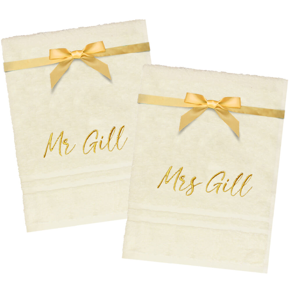 Celebrate their special day with our Personalised Mr & Mrs Cream & Gold Wedding Bath Towels Gift Set. These luxurious towels feature elegant gold embroidery on a soft, cream background, adding a touch of sophistication to any bathroom. Perfect for newlyweds, each towel can be personalised with the couple’s name, making it a truly unique and thoughtful gift.