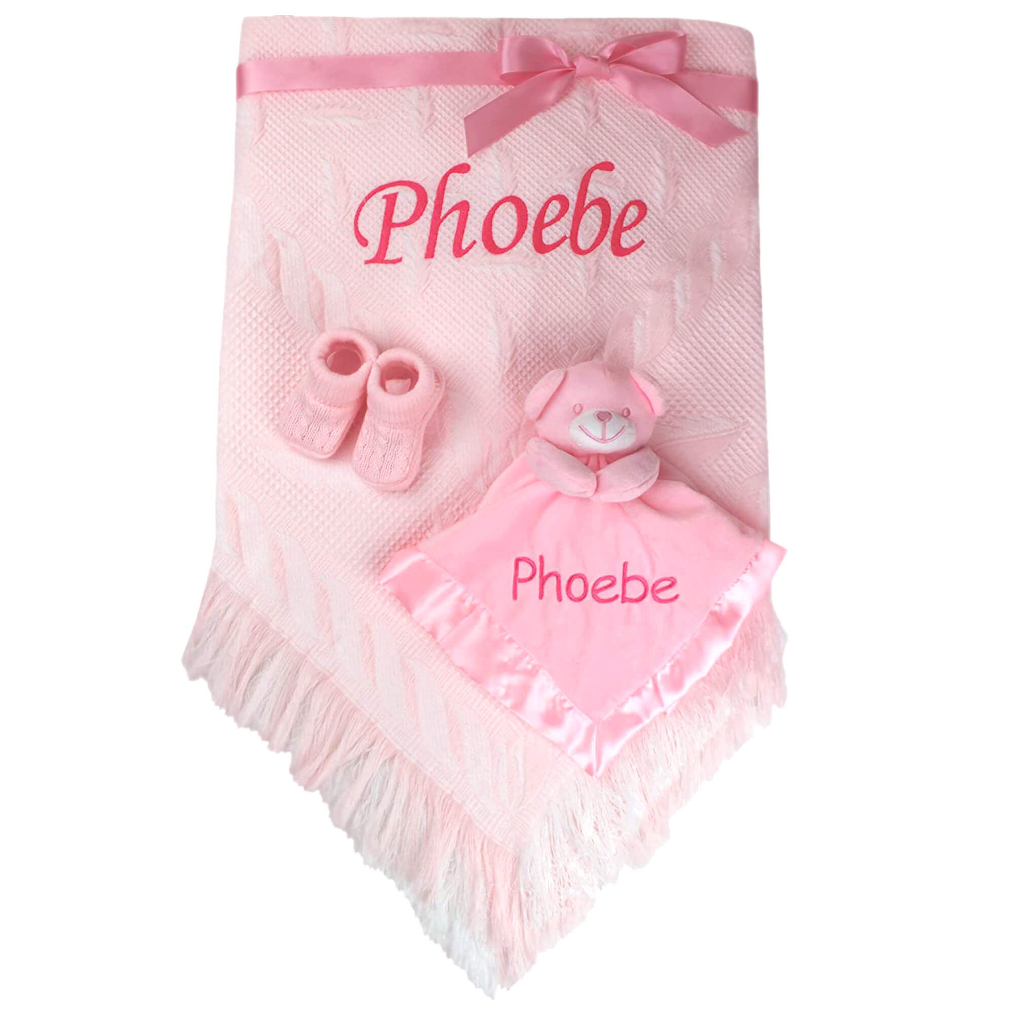 Personalised Pink Baby Shawl, Teddy Comforter & Knitted Sock Boots Gift Set