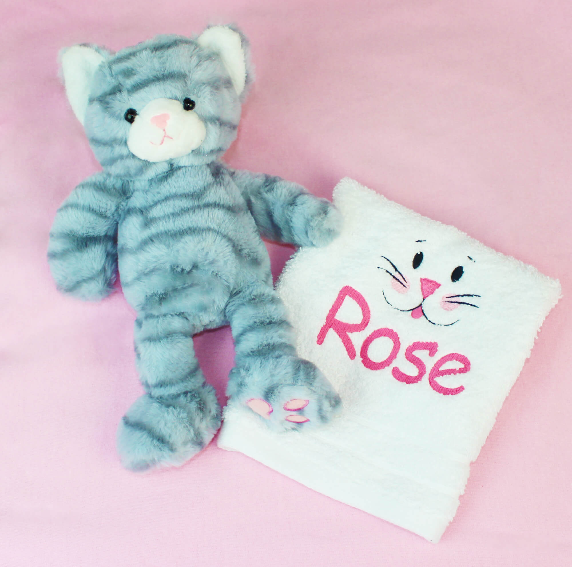 A pink bunny design face cloth flannel to personalise as well as a kitty toy. This perfect gift is personalised with high quality embroidery!