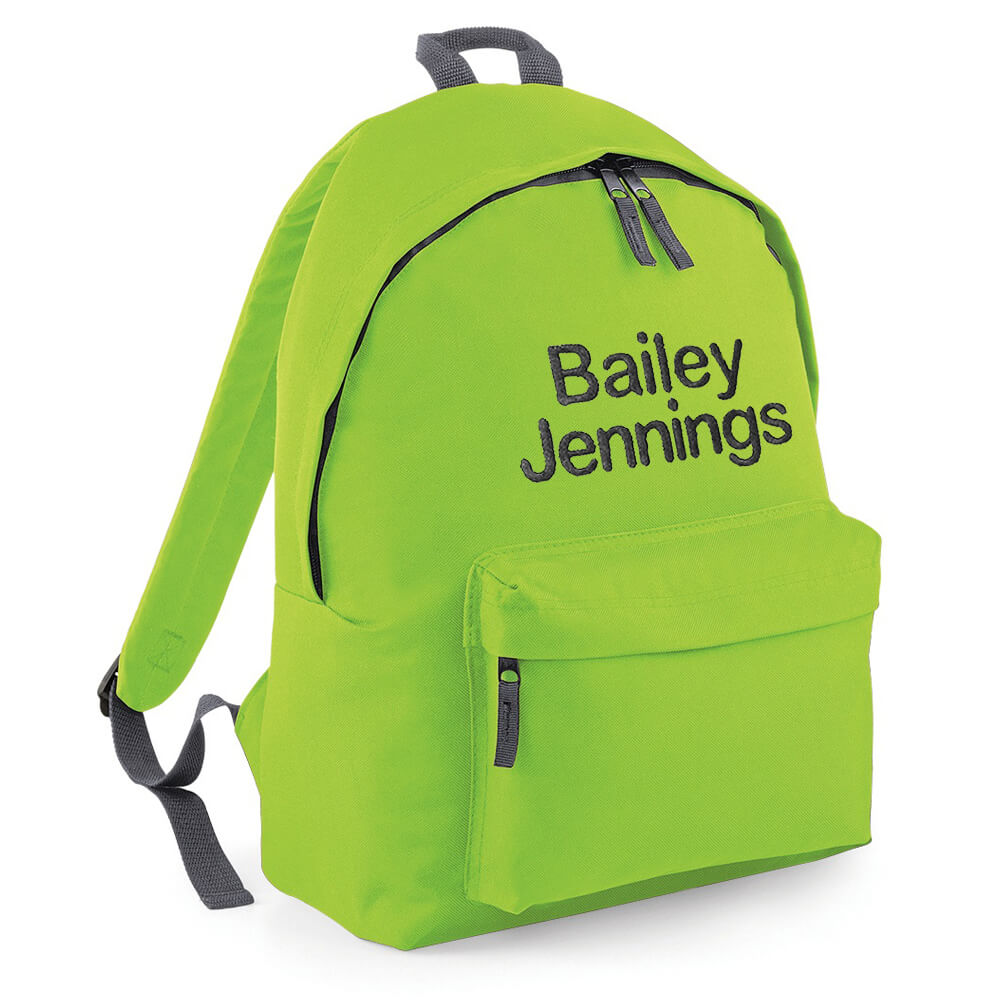 This vibrant bright green kids’ backpack features top-quality custom embroidery, allowing you to personalise it with your child’s name and class or surname, while its spacious design includes a large main compartment and a front zip pocket for easy organisation, with adjustable padded shoulder straps ensuring comfort for growing children, making it perfect for back-to-school, extracurricular activities, sports, and weekend outings!