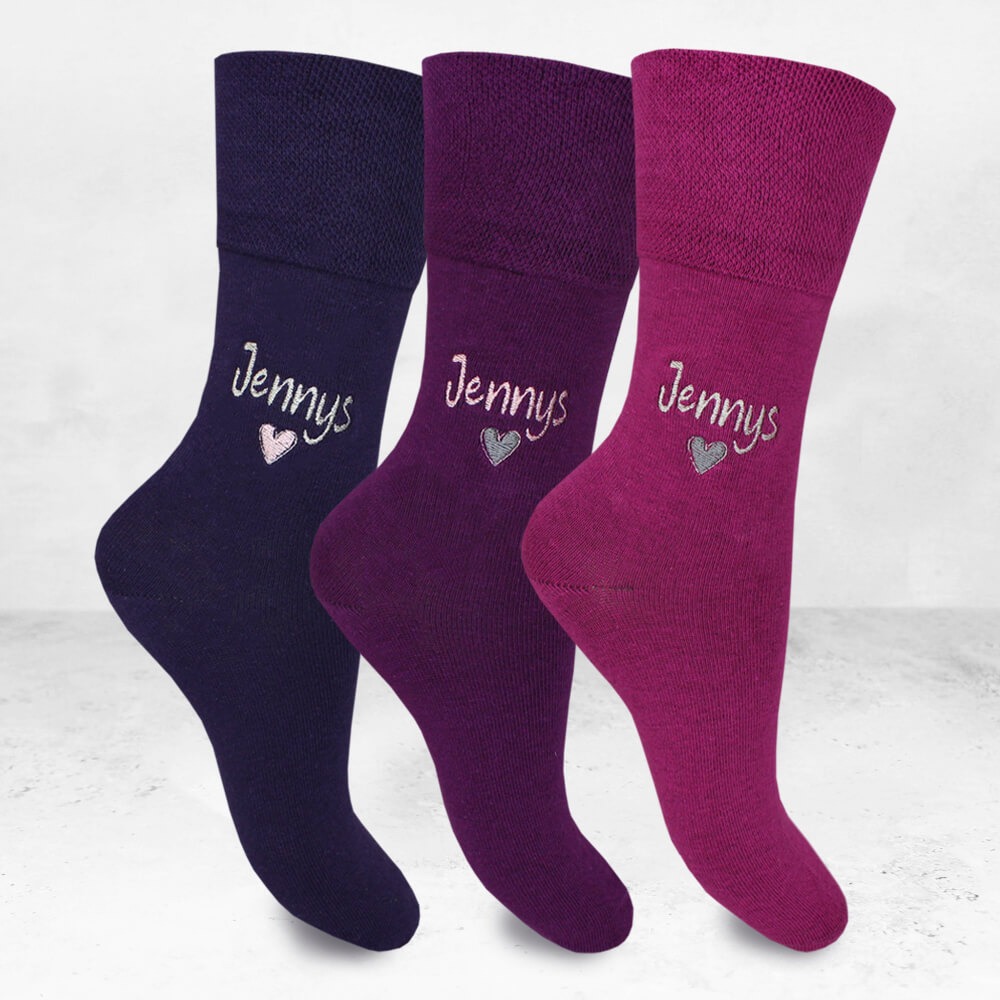 This 3 pair pack of super soft feel, cotton rich purple socks are designed with a gentle grip honeycomb top instead of elastic, providing all day maximum comfort! Add your own personalisation above the love heart design to create a lovely gift.