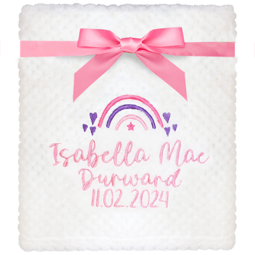 This personalised fluffy pink annd purple rainbow baby blanket makes a special new baby gift. Its super soft and fluffy texture keeps the baby snuggly and warm embroidered with baby’s name and date of birth. This thoughtful present adds a personal touch and provides comfort for the little baby girl.