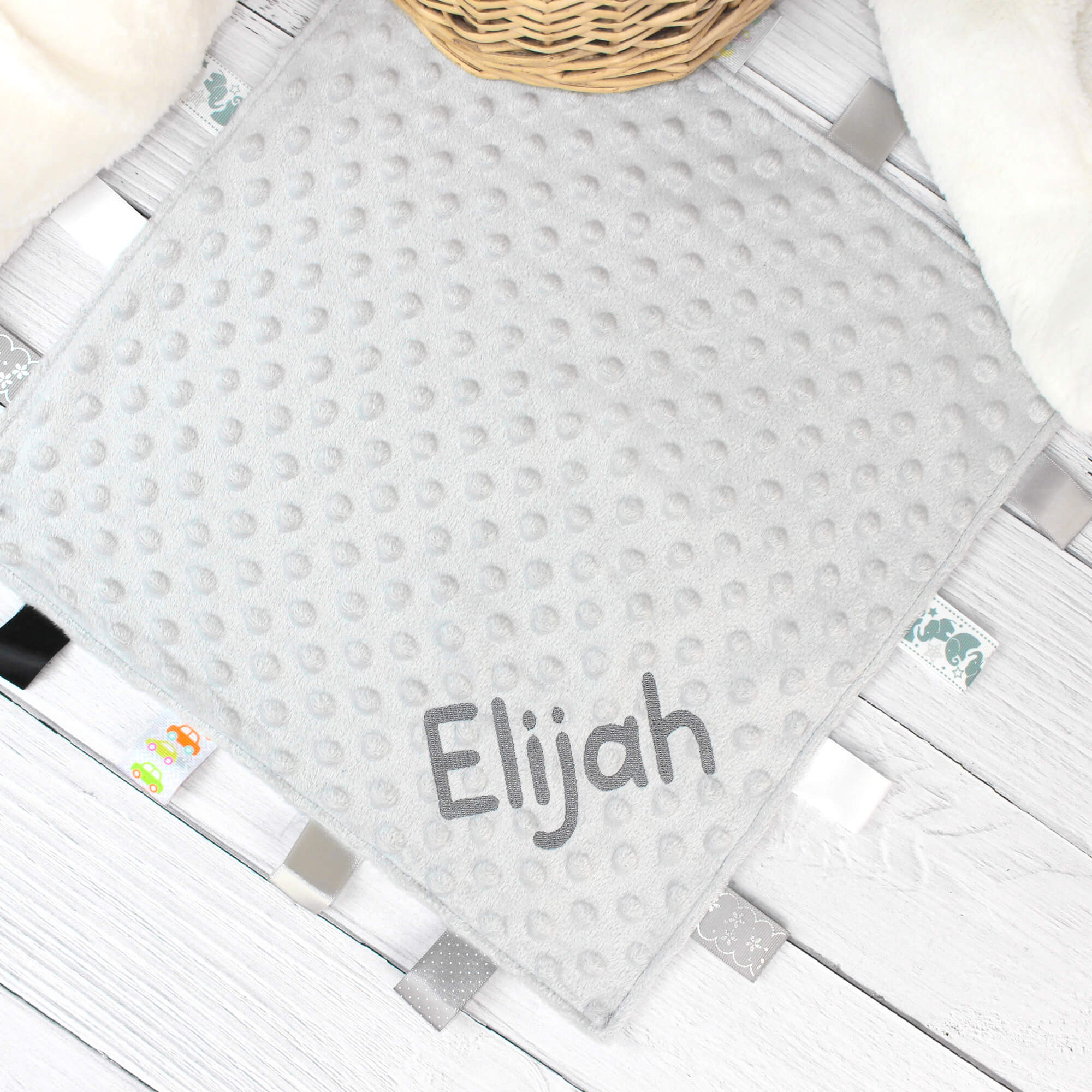 Personalised Silver Grey Baby Taggy Blanket Ribbon Comforter