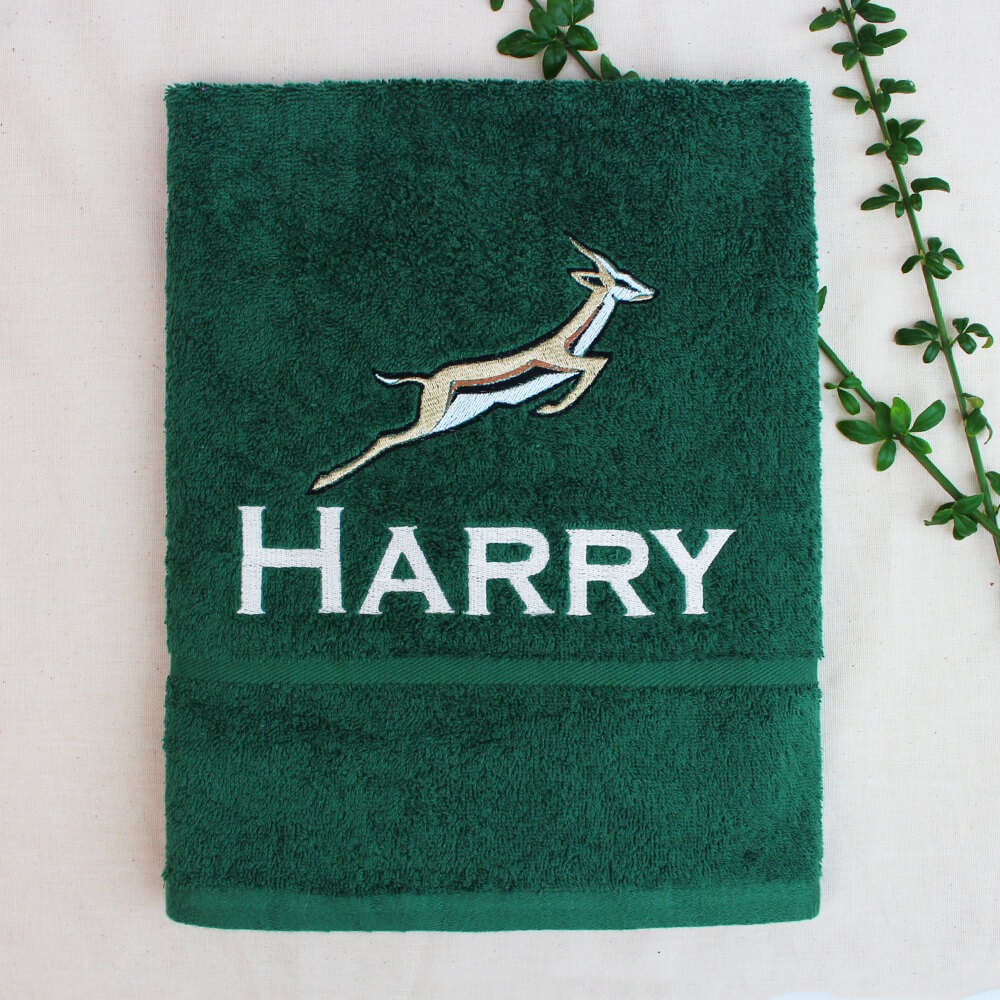 Perfect for supporting your rugby favourites and helping you be a little less muddy! The famous South African springbok sits on this super soft cotton hand towel, make it a perfect gift by personalising it with top quality embroidery for an extra special touch!