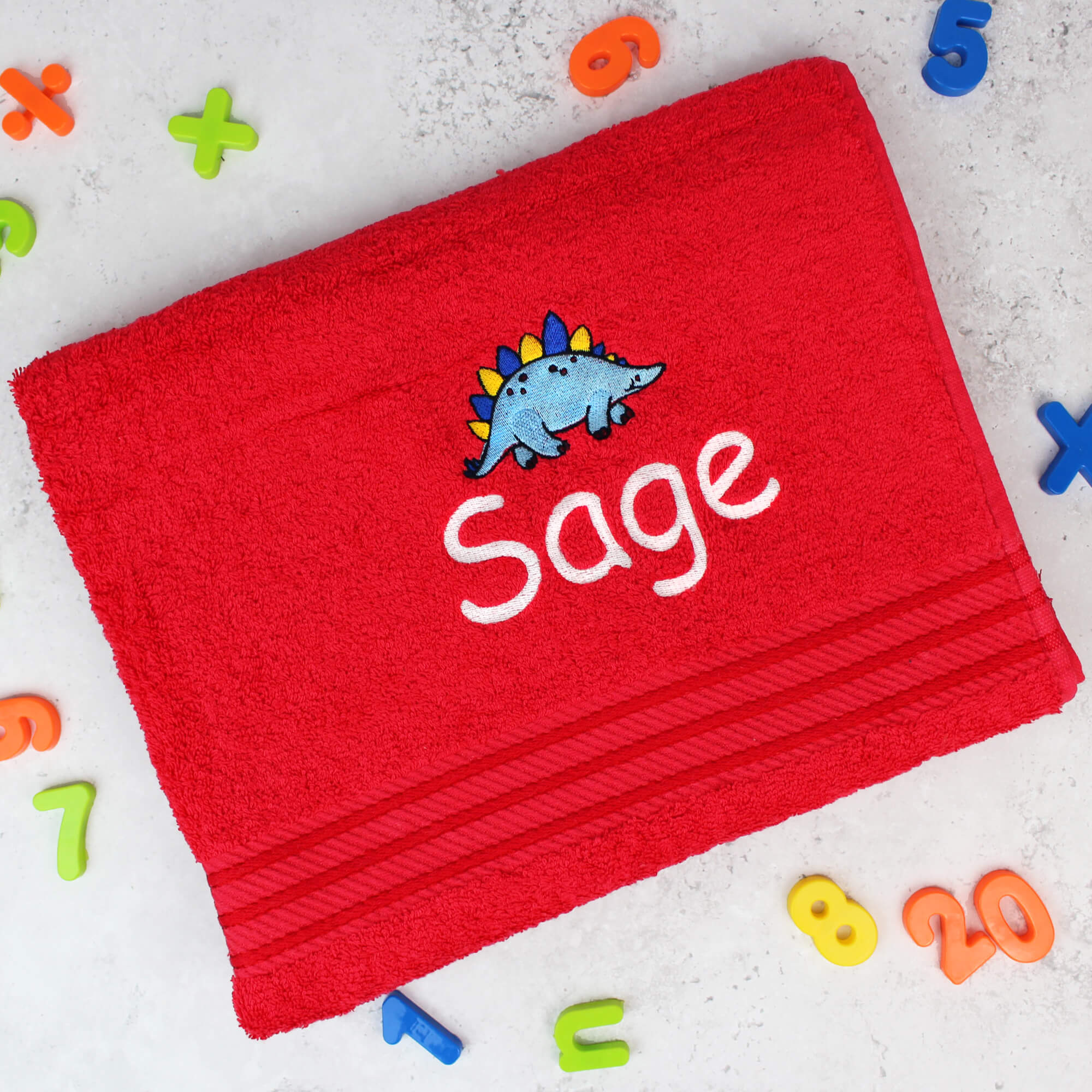 Personalised Kids dinosaur towel with stegosaurus design. Personalised Embroidery on super soft bath towel.