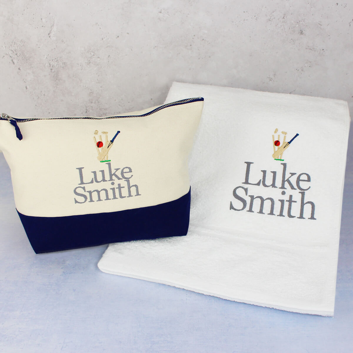 The season of cricket is here! Get equipped with our embroidered matching bath towel and washbag set in white and cream cotton!