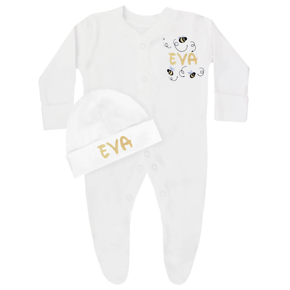 Personalised Gold Embroidered Baby Sleepsuit and Hat. This tiny sleepsuit and hat set is ideal for babies up to 6lb, offering a snug fit for precious little ones. The adorable gold bumble bee embroidery adds a touch of charm to this special gift, making it a delightful keepsake for new parents. This set is not only practical but also a thoughtful gesture for parents welcoming their little one, providing both style and comfort for the tiniest of bundles of joy.