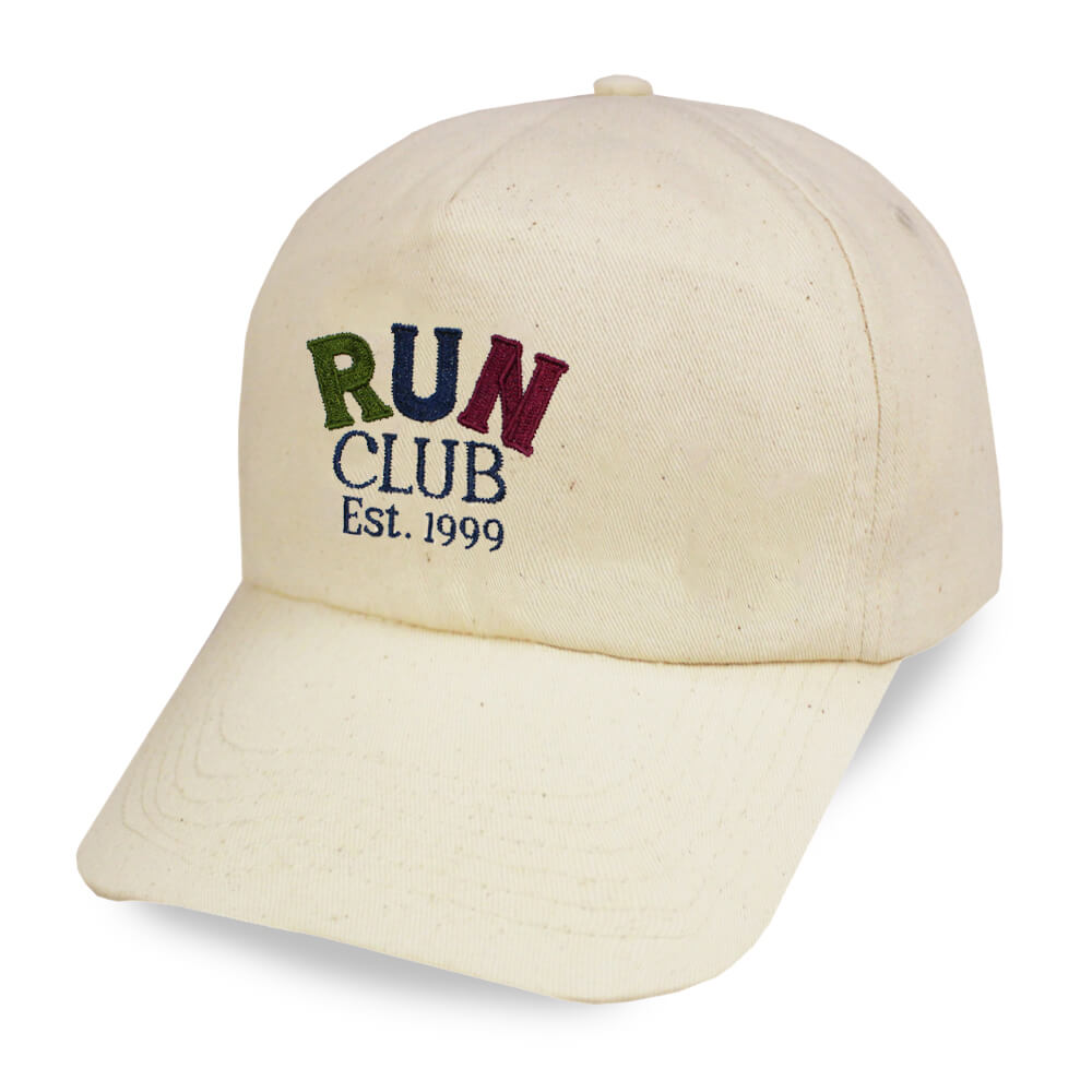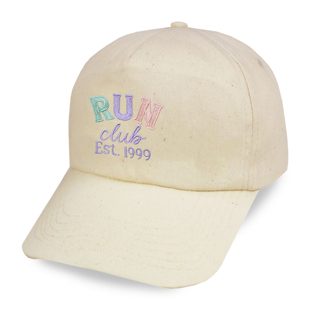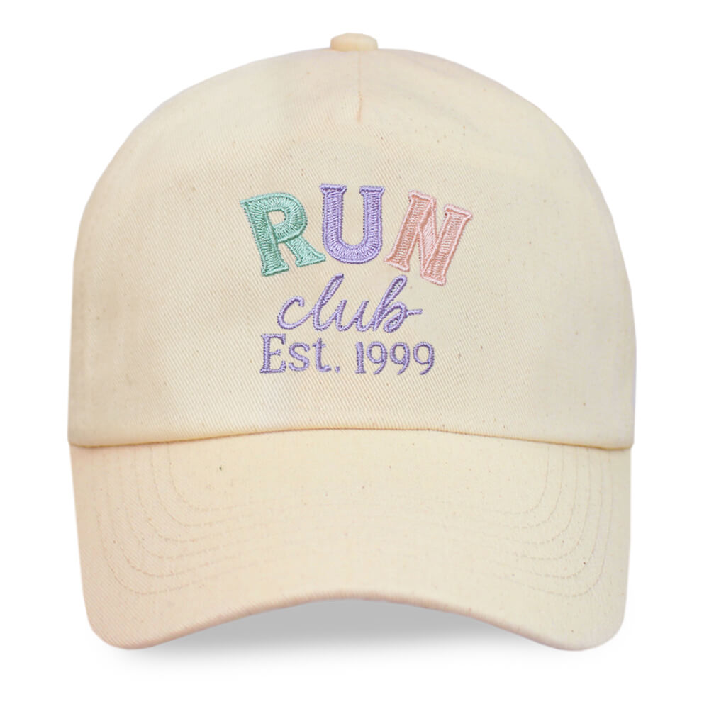This cap brings cool vibes and cooler shade—made for pace chasers, park loopers, and coffee-after runners. Run Club cream cap with pastel or earthy tone embroidery!