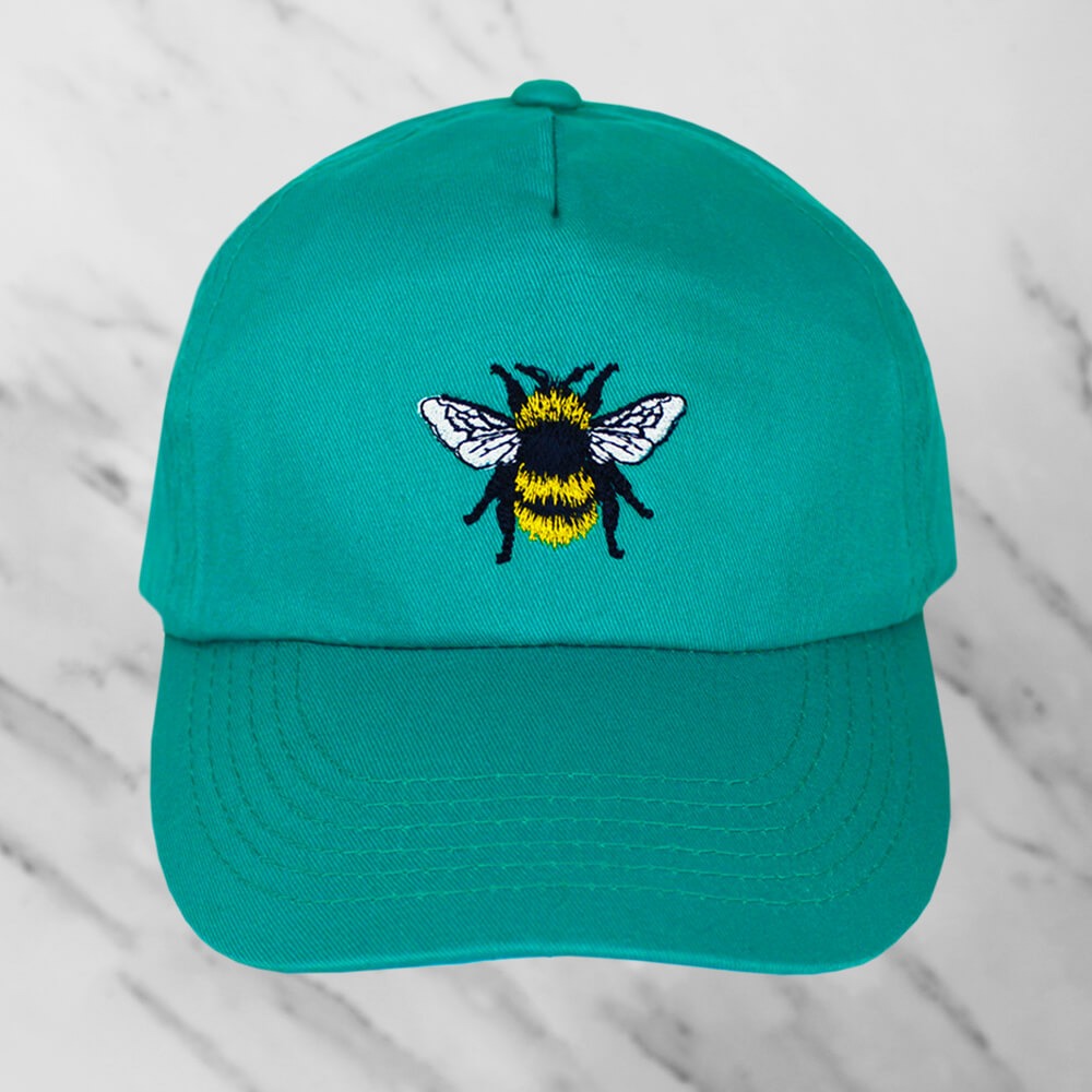 The humble bumblebee stitched in royal gold specialist metallic yarn features on these richly-coloured baseball caps, they make a gorgeous gift!