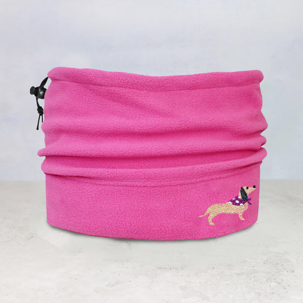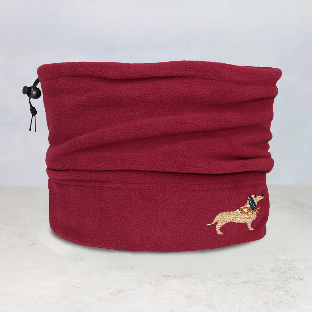 Our women’s toggle thermal snood features a fabulous embroidered Dachshund motif with its very own glittery neckerchief! Look smart and keep cosy this winter in super soft thermal fleece, this fully adjustable snood is perfect for hiking, walking the dog or climbing a mountain! Choose from three fashionable colours – pink, purple or maroon red, we think it’s difficult to pick just one!