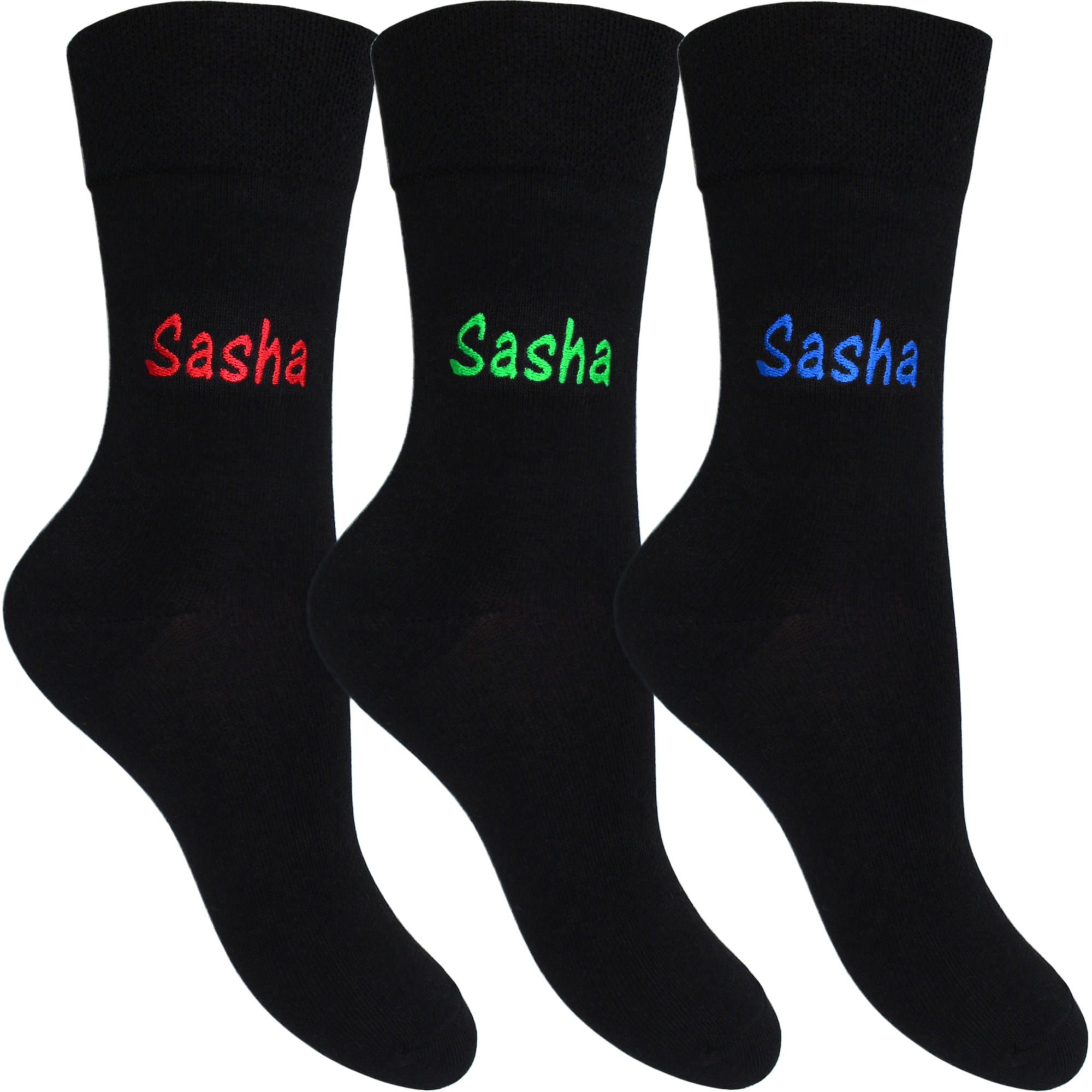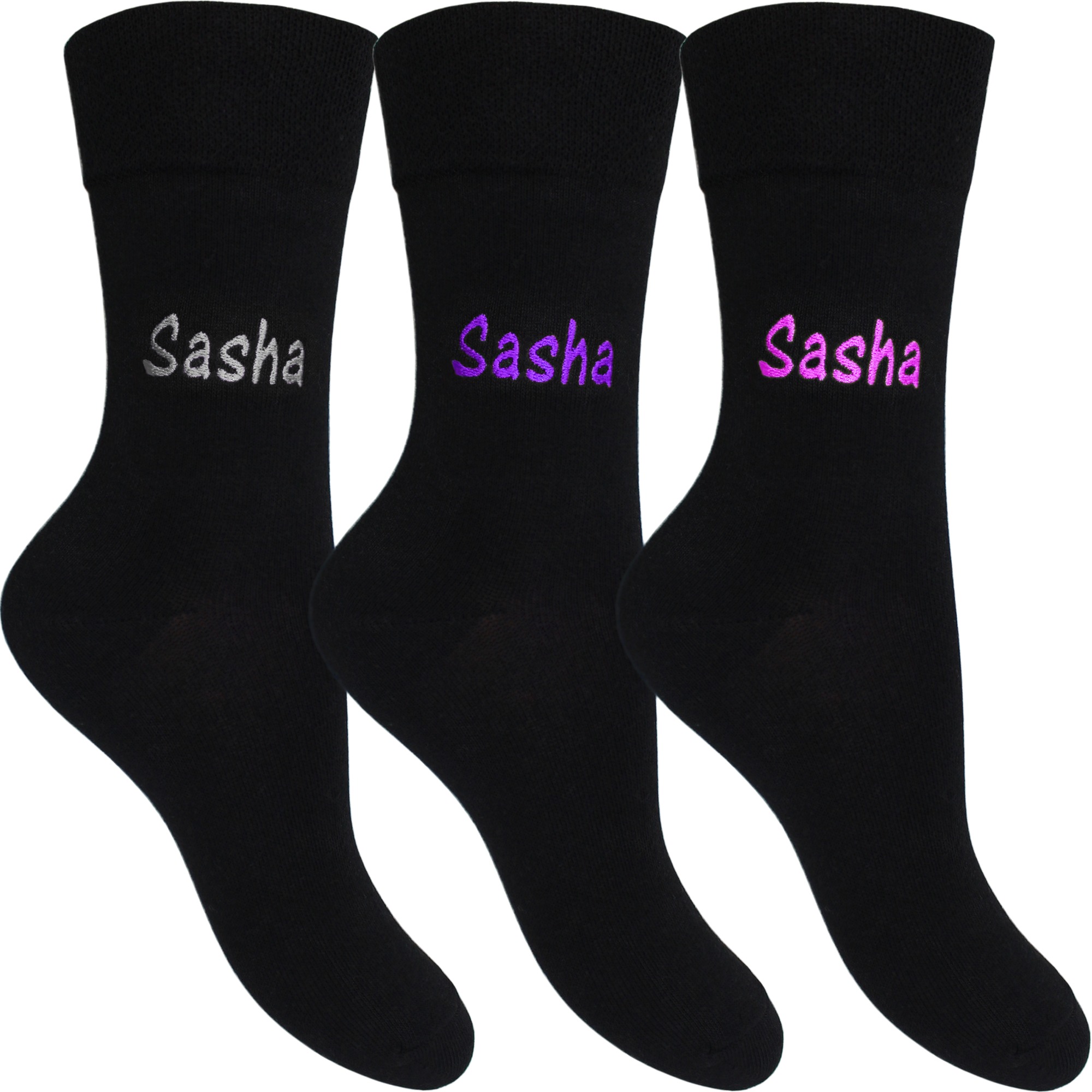 Our cotton rich women’s personalised black socks have a super soft feel for maximum comfort and with a flexi non-elastic top they are ideal for those with poor blood circulation or diabetes. A practical and smart gift, these socks come in sets of three with the name of your choice embroidered onto each pair and are available in two colour options – red, green and blue or silver, purple and pink. We think both colour options look great contrasting against the black sock base!